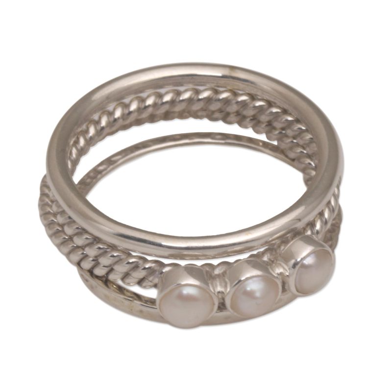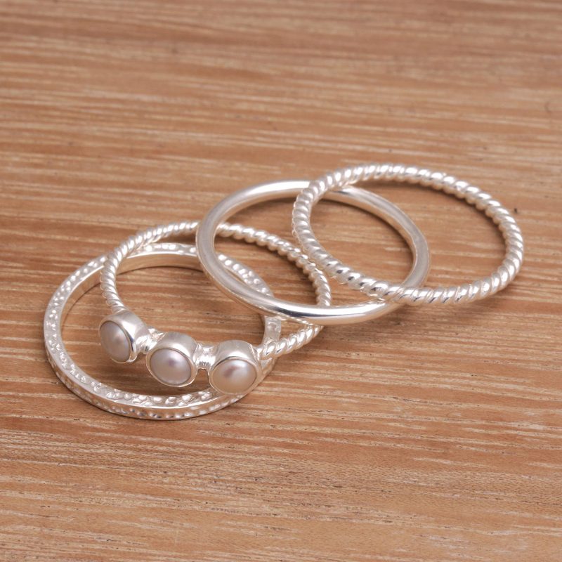 Backed by our 100% Happiness GuaranteeWith four uniquely designed bands that nestle perfectly side-by-side, these stunning stacking rings are an eye-catching adornment. Balinese artisan Made Sri crafts each band of this four-band stacking set with a different motif. Three bands feature polished, hammered and rope designs, while the fourth band features three white cultured pearls on top for an elegantly simple stacking ring set.