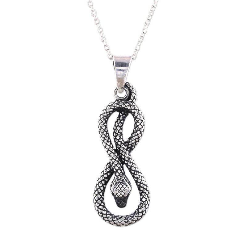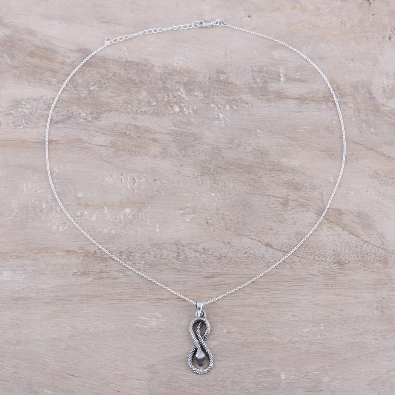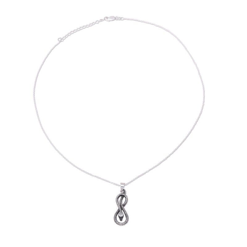 Coiling ever so beautifully, a charming serpent twists its way into an exquisite pendant in this elegant and unique sterling silver necklace. Designed by Neetu Barathi of India, the pendant necklace is handcrafted from 925 sterling silver and given an oxidized finish to enhance the enchanting details of the writhing serpent. A cable chain with adjustable loops and a lobster claw clasp complete the design.