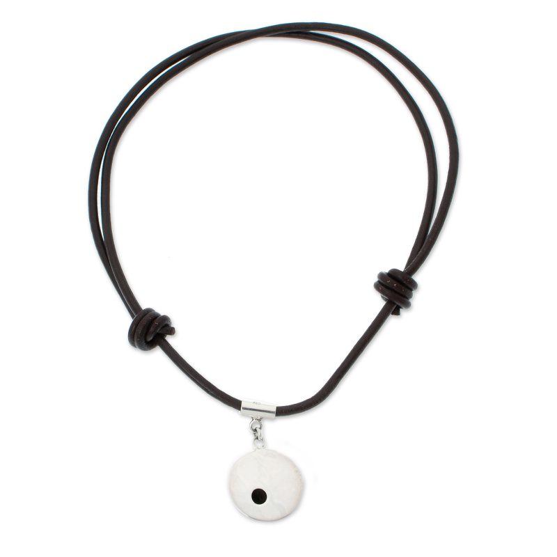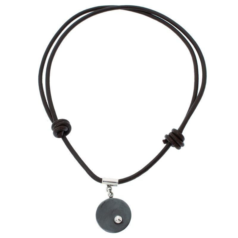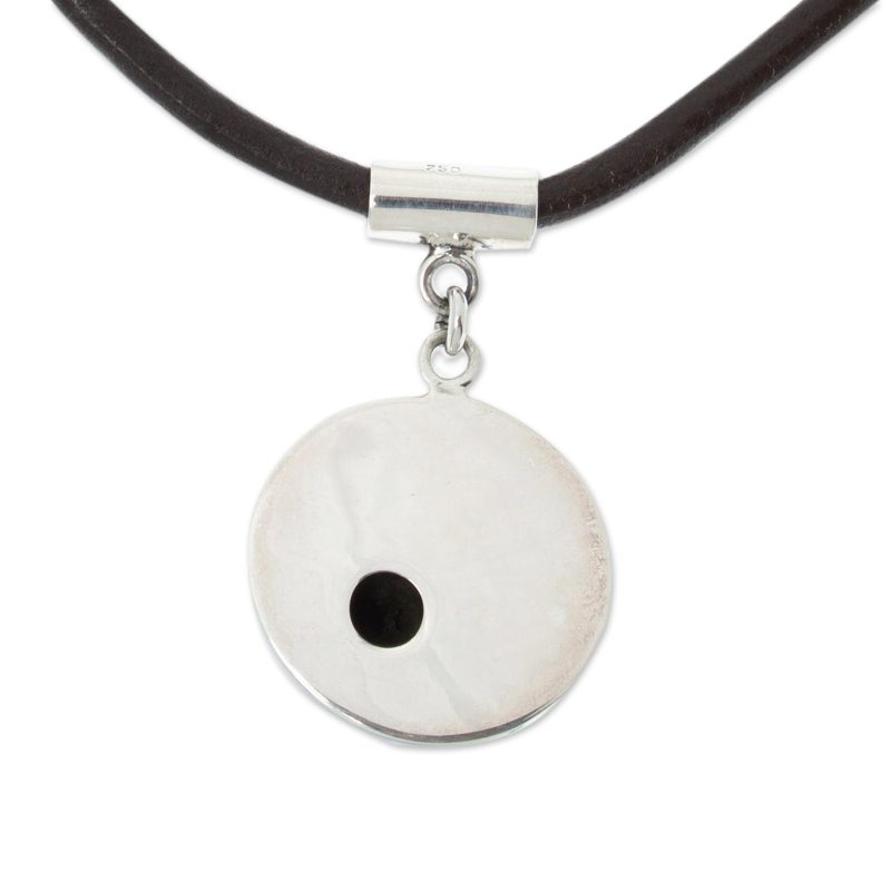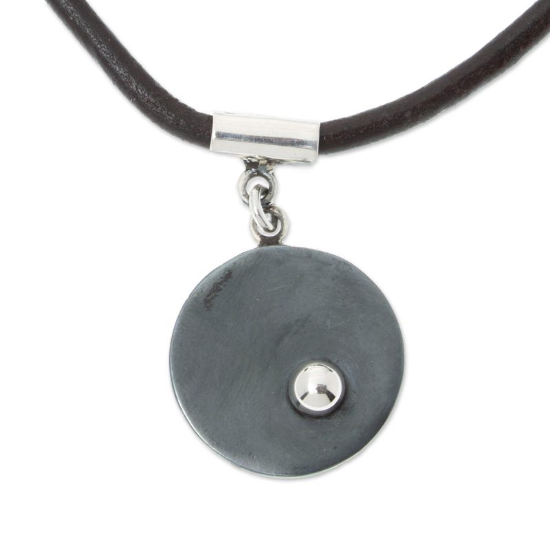 Mexico's center for handcrafted silver has been, for generations, the small town of Taxco, near Mexico City. While its traditional pieces are a sight to behold, some of its younger artisans look to expand the town's repertoire. Here, 950 silver is used to create a more modern pendant, while the necklace is a brown leather cord, with allows the length to be adjusted. The pendant features an orb shape with a black oxidized dot.