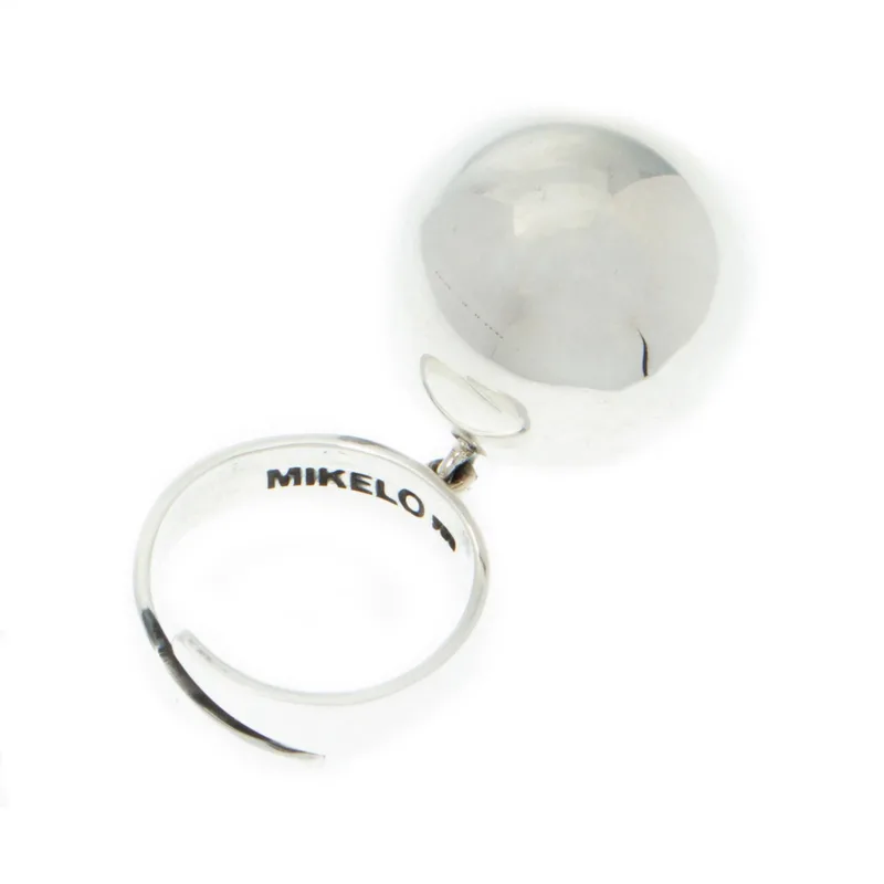 Both innovation and respect for the past are important to keeping a craft tradition alive. Up-and-coming Taxco artist Mikelo combines the two here with a sleek fine silver ring. The techniques used to craft it are generations-old, but the design — a high-polish orb which dangles from the band — is quite modern. The ring is signed by the artisan.
