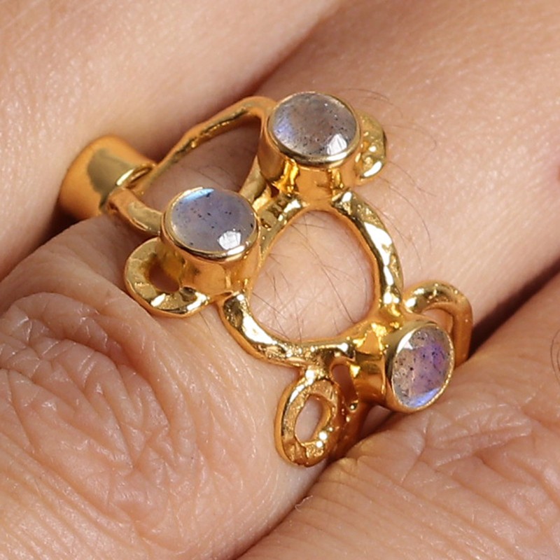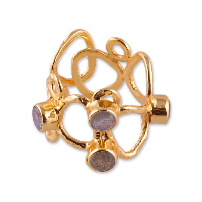 The sophisticated enchantment of the minimalist style fuses with the enigmatic beauty of natural labradorite jewels in this avant-garde accessory by Neetu Barathi of India. The artisan works with local artisans to craft this stunning cocktail ring, whose diverse stones decorate the band. In addition, a high polish finish enriches the piece's radiant light, allowing for a dapper look.