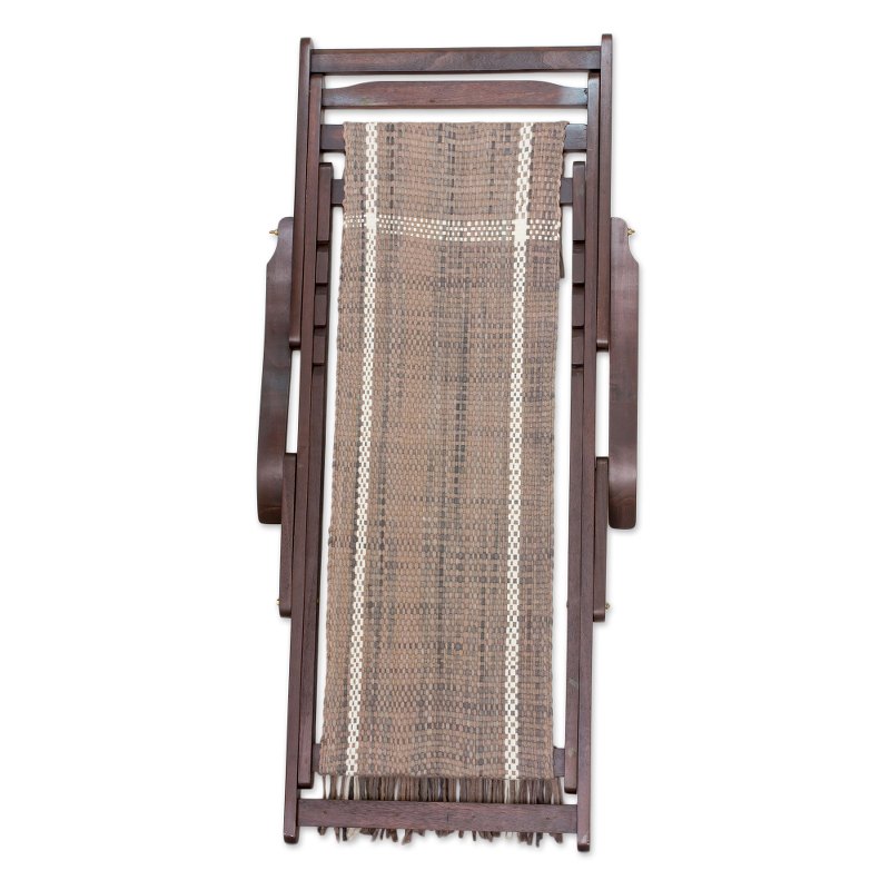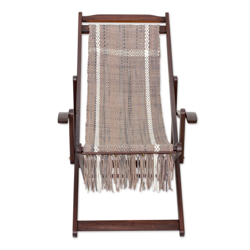 Crafted by Costa Rica's Arrieta Roman Family artisans, this handwoven hammock chair takes comfort to a new level. Made with a dark brown laurel wood frame, its cappuccino-colored fabric with white stripes is handwoven with a blend of recycled cotton and polyester fabric trimmings reclaimed from garment factories. A row of fringe hangs from each end of the seat, and the chair back can be adjusted to four different positions.