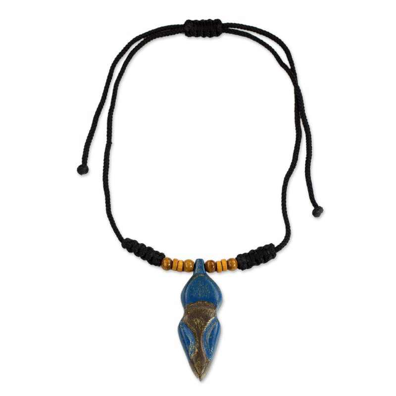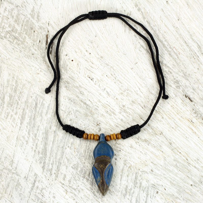 A pendant is hand-carved of sese wood, centering a length of black cord. Ghanaian artisan Robert Aidoo-Taylor creates this necklace, flanking the pendant with petite wood beads and discs. He paints the pendant in colors of blue and black, naming it Akwatia, after a Ghanaian diamond mining town.