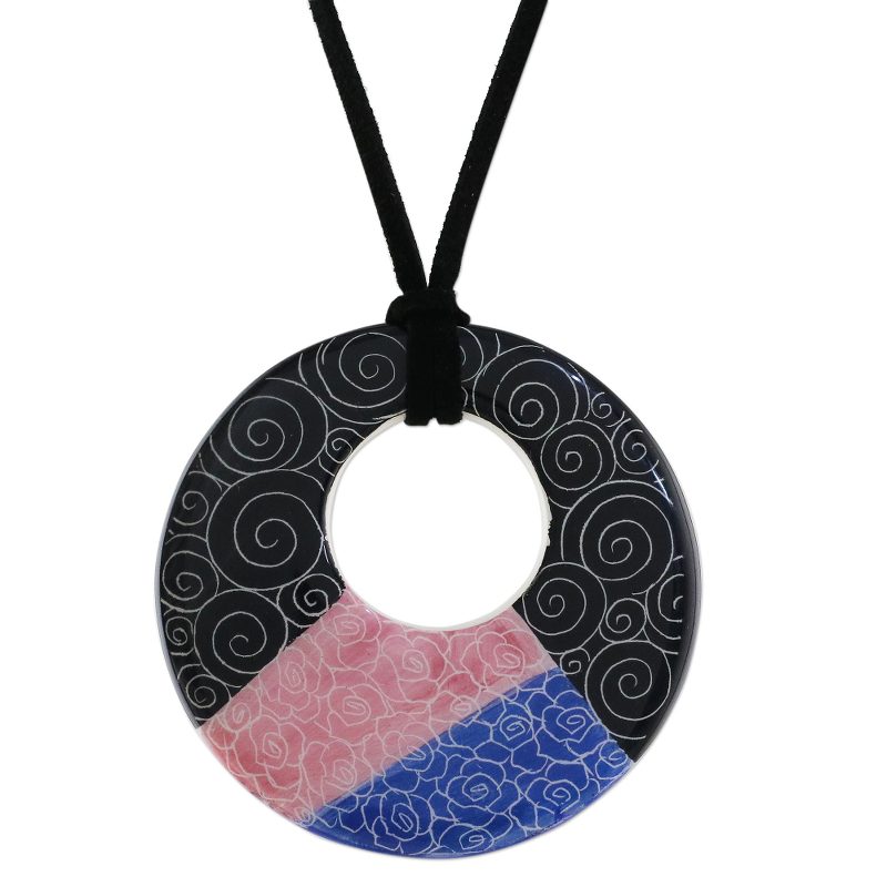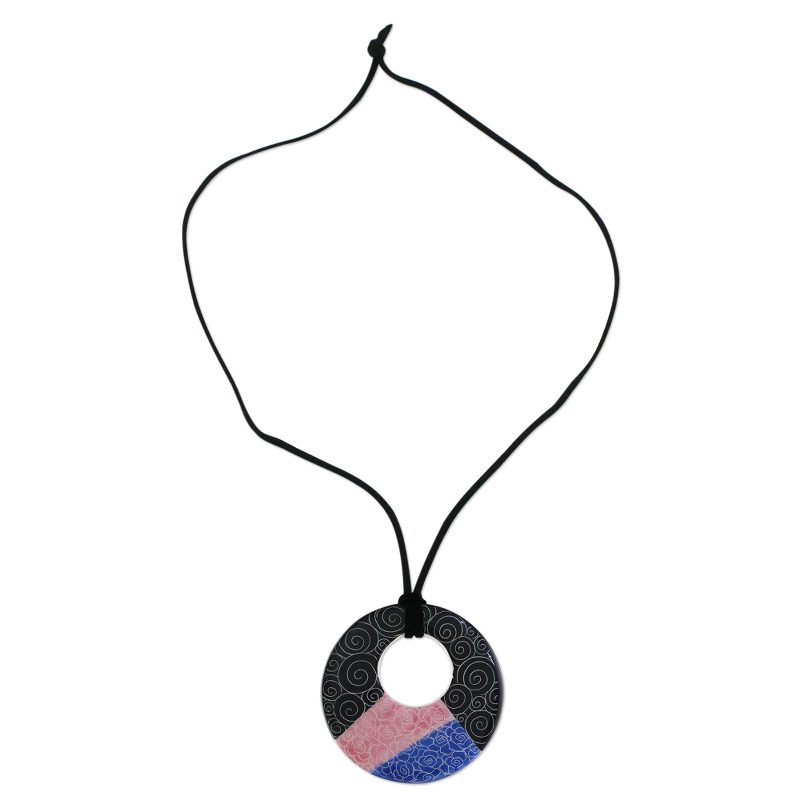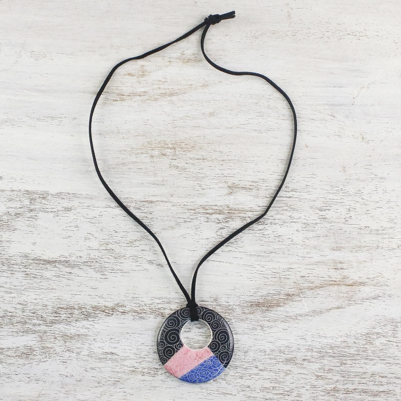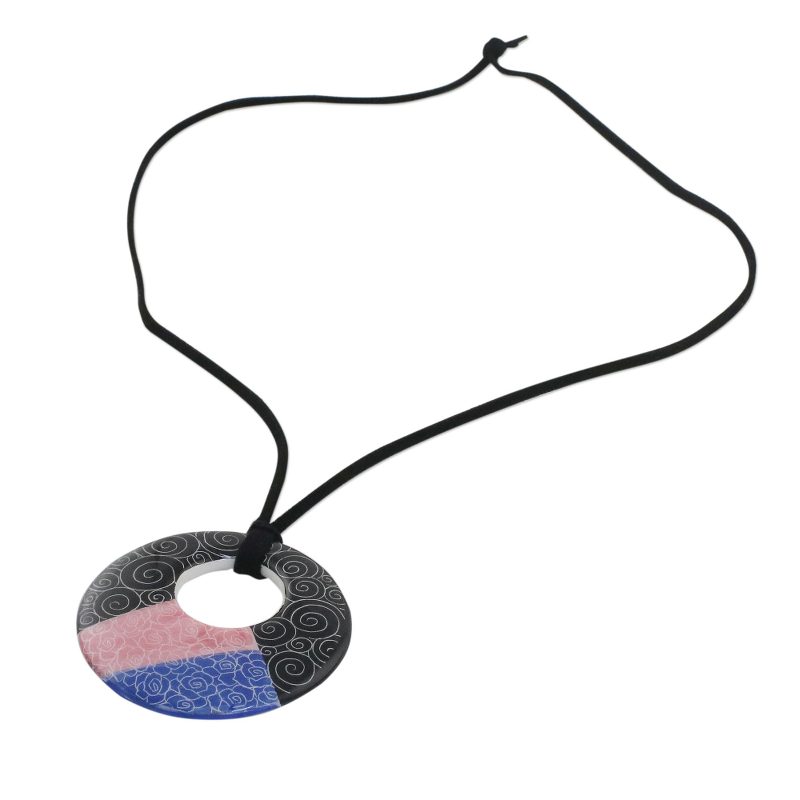 Jewelry artist Napat Chotpruekchookul employs a modern design in this intriguing Thai necklace. The hollowed round ceramic pendant features a segmented motif that is comprised of swirling shapes and sketched roses. The faux suede cord is adjustable in length.
