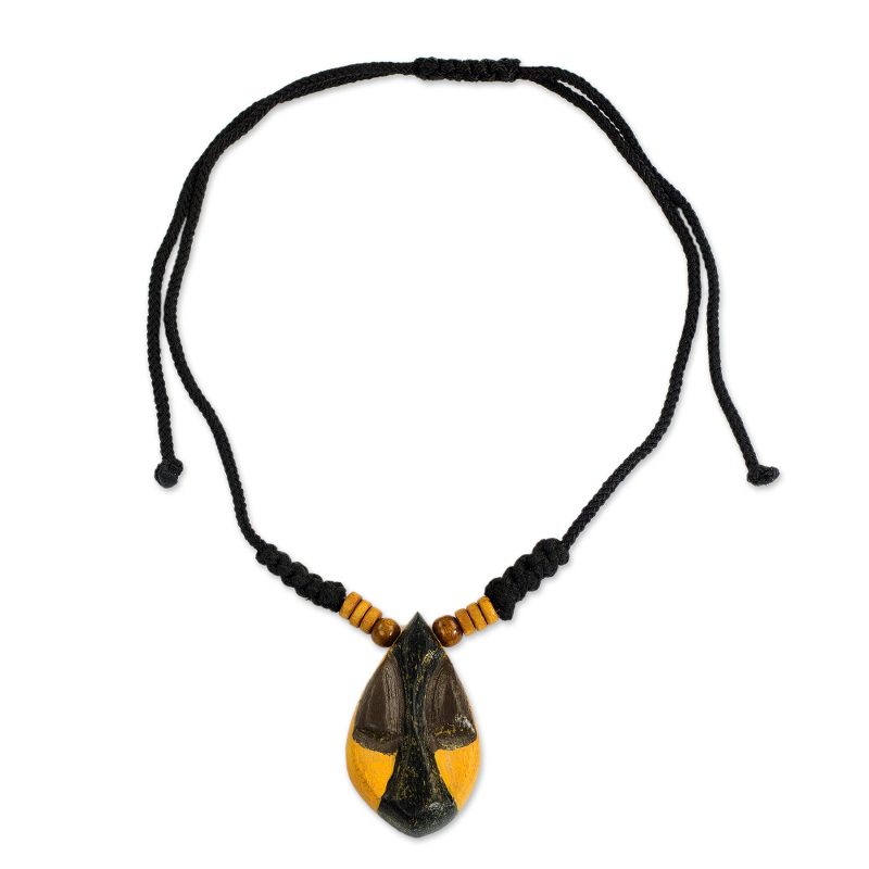 For this necklace, Robert Aidoo-Taylor designs a stylized female mask in yellow, brown and black which he calls Manubea, a traditional Akan name. The Ghanaian artisan carves the sese wood pendant by hand with experienced mastery and sets it on a black cord necklace that can be worn at the desired length through a sliding knot.