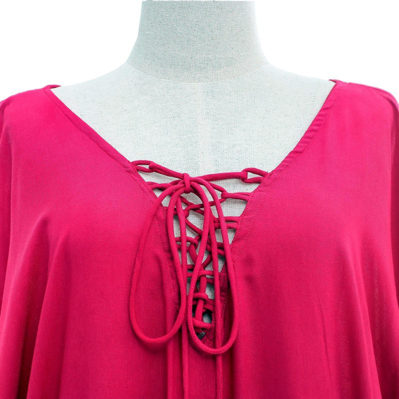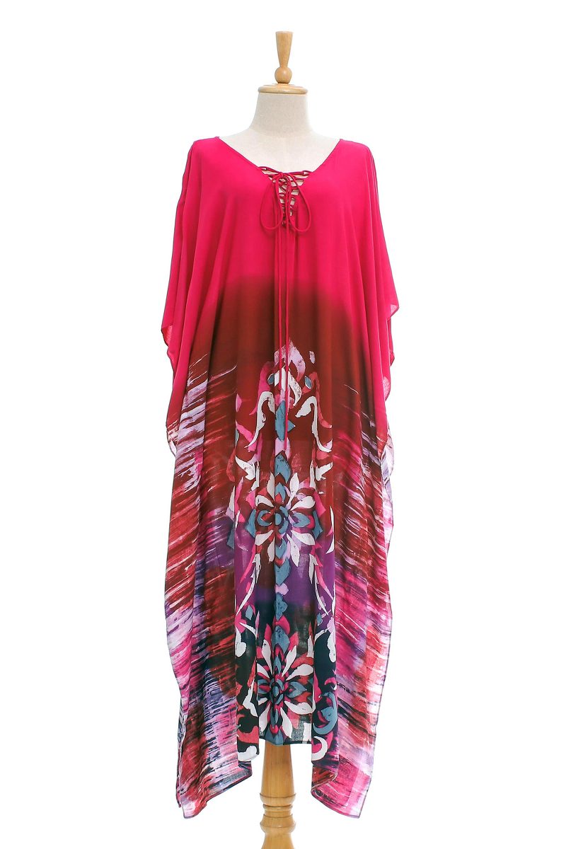 Backed by our 100% Happiness GuaranteeHand painting using the batik method (a wax-resist dyeing process), this cool all-cotton caftan makes an entrance. Solid fuchsia and crimson segue into an abstract pattern of blue, purple, pink and white. Featuring a v-neckline with lacing, the comfortable caftan from Akkaraphon in Thailand can be worn as a dress, loungewear, or a coverup at the pool or beach.