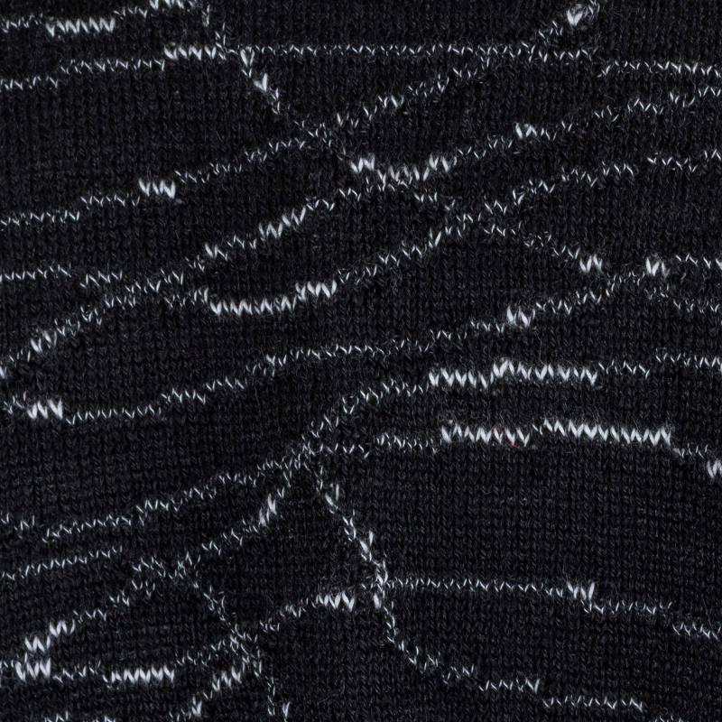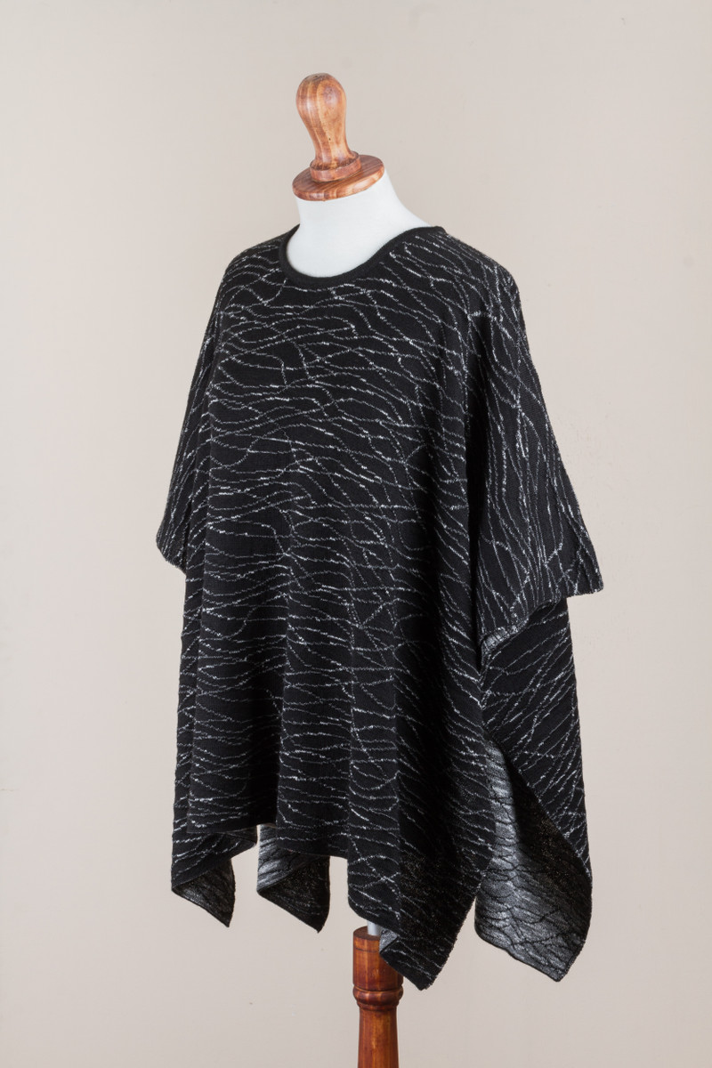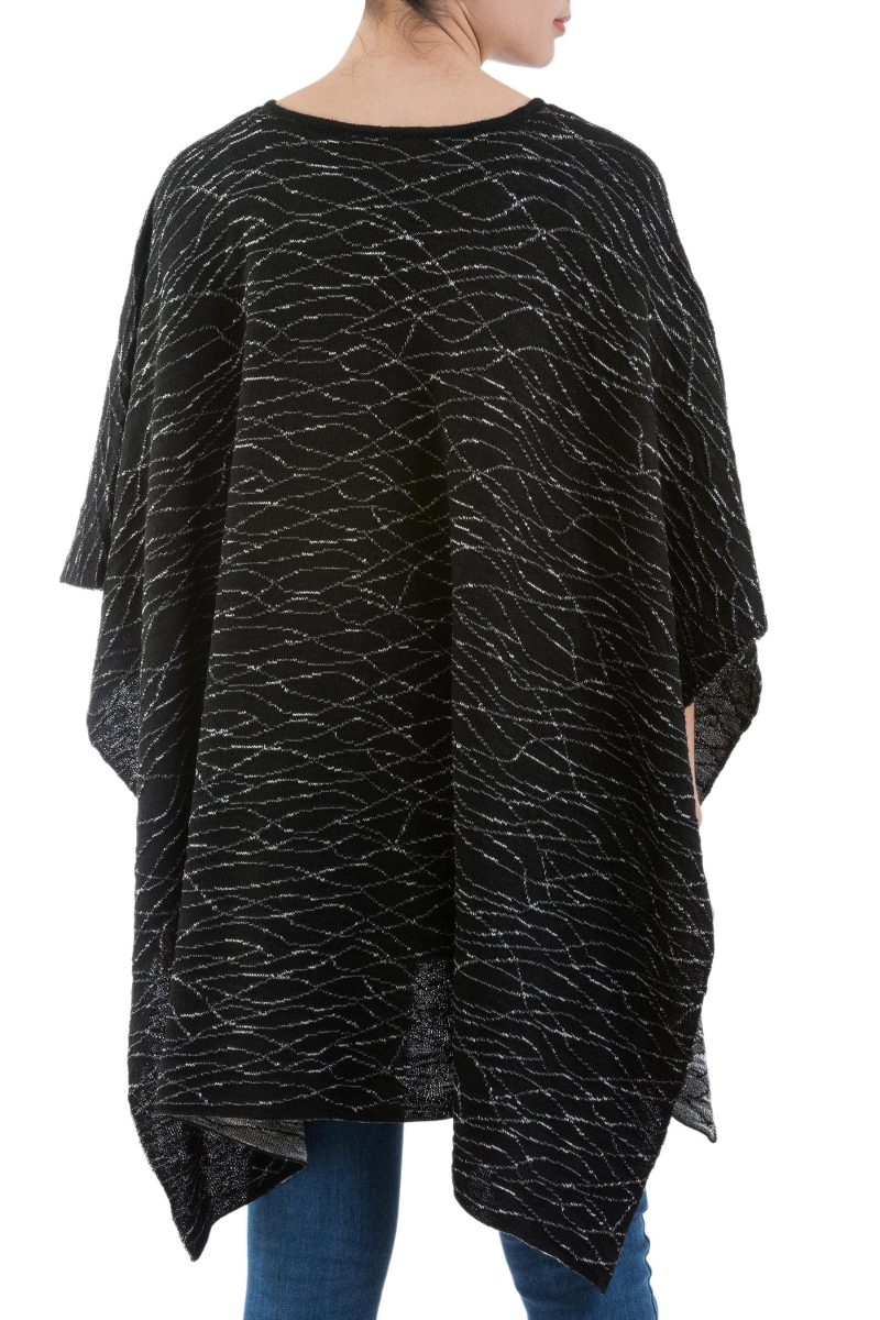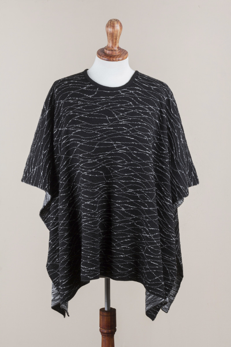 Wavy motifs in eggshell white adorn a body of black in this Peruvian poncho, reminiscent of diffracted light through a body of water. Waldo Berrios is proud to present his own designs in this poncho, knit from alpaca blend fibers by local artisans.