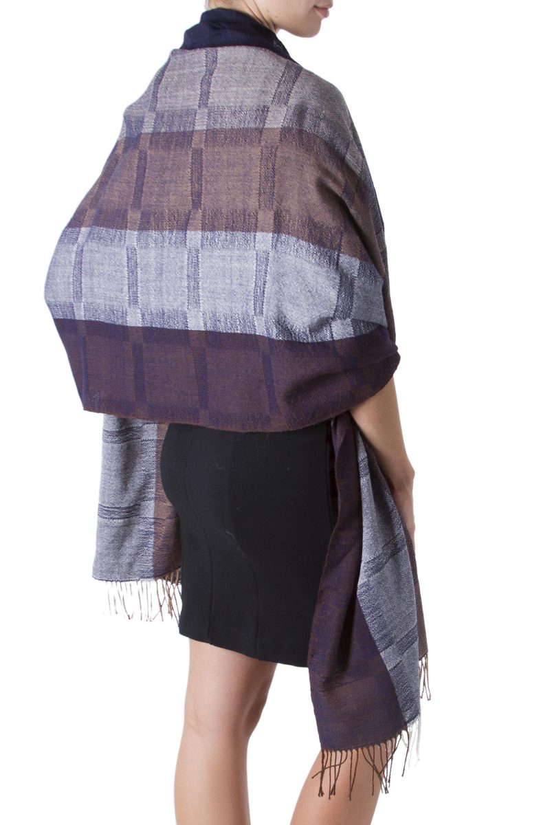 Backed by our 100% Happiness GuaranteeWoven by hand, subtle shades of brown, gray and rich navy blue conjure the night. This generous and elegant shawl by Wilmer Vilchez comes to life in luxurious alpaca wool.