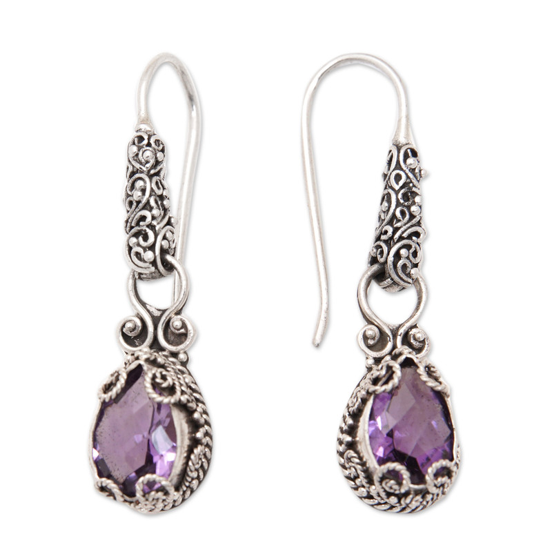 Make a bold statement with these dreamy sterling silver dangle earrings adorned with resplendent faceted pear-shaped amethyst gemstones that exude absolute sophistication. This exquisite design from Dewi Putera is elevated by intricate swirl motifs and a harmonious blend of polished and oxidized finishes that showcases the exceptional craftsmanship of Bali's finest jewelry artisans.