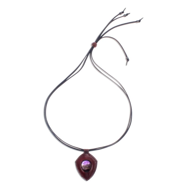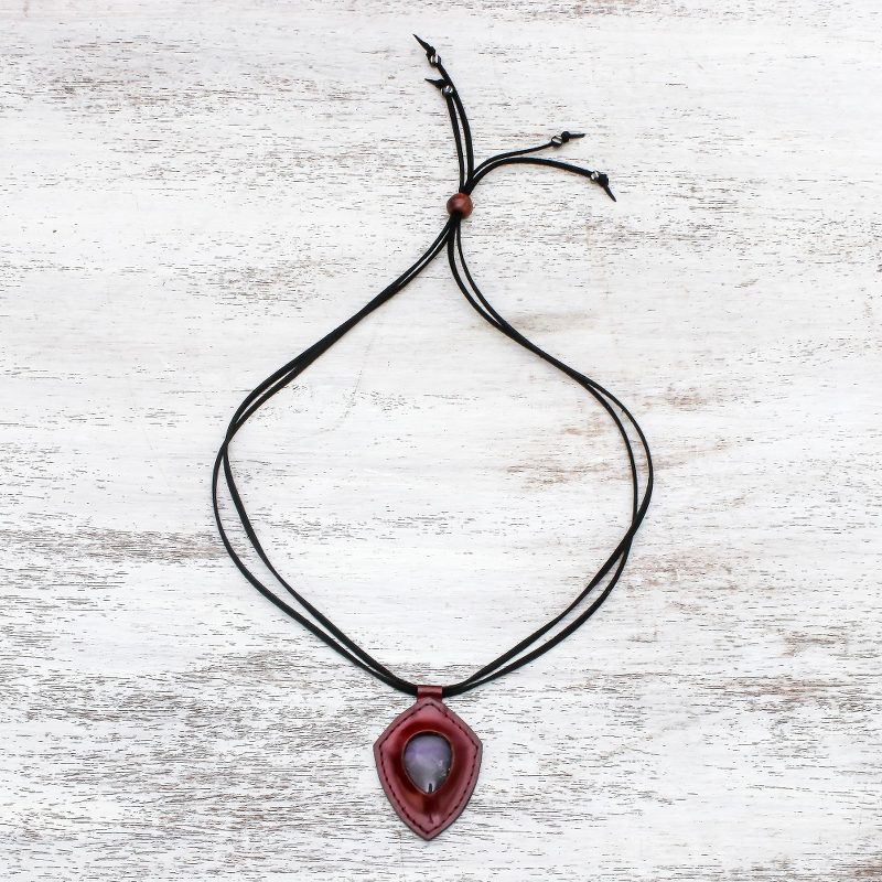 Resembling a bold shield, an amethyst gemstone is displayed within a frame of red leather. Chaloemphon presents this rustic Thai pendant necklace, circling the neck with a double strand of faux suede cord that adjusts with a sliding bead of raintree wood. Petite beads of black and white wood decorate the ends of each cord.
