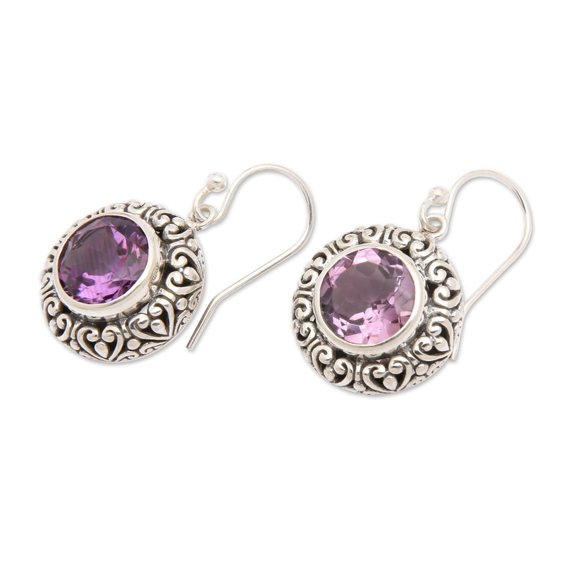 Backed by our 100% Happiness GuaranteeSwirling motifs in sterling silver surround three carats of sparkling, dewy amethyst stones. Kadek Wijanegara presents a majestic pair of dangle earrings, diligently crafted by local Balinese artisans.