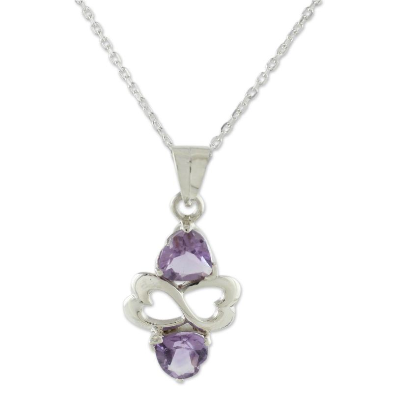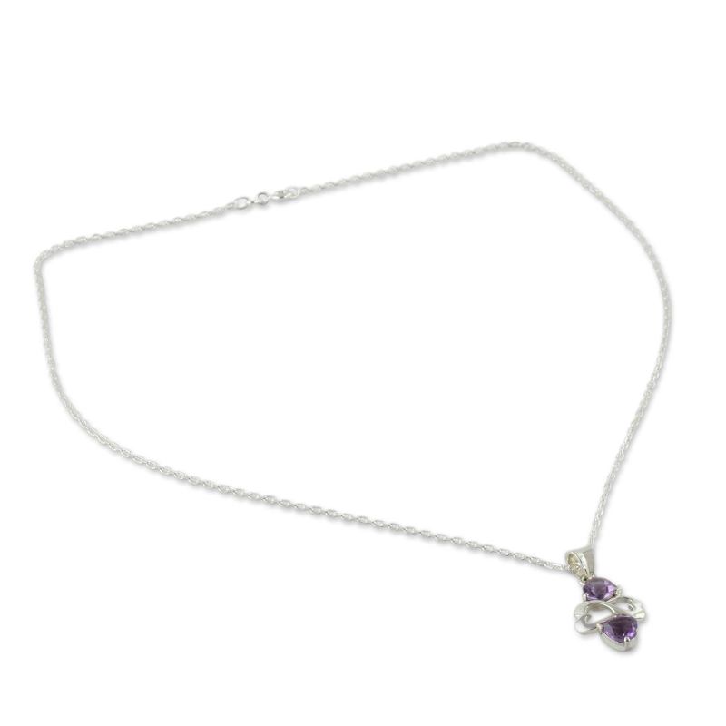 Backed by our 100% Happiness GuaranteeA cluster of hearts glistens with love's wise energy in this necklace from India. Shubhra Singh creates the modern design of this necklace with sterling silver hearts flanked by amethysts, gem of spiritual wisdom. The faceted gems total 2.5 carats.
