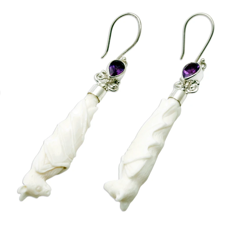 Backed by our 100% Happiness GuaranteeSleeping bats meticulously hand-carved from bone have the starring role in this pair of striking dangle earrings designed by artisan Ayu Ary in Bali. Featuring sterling silver accents and hooks, the earrings are crowned by shimmering pear amethysts that add to their uniqueness.