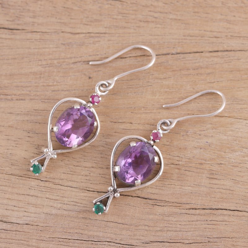 With a sparkling allure, this pair of Indian dangle earrings is guaranteed to add a touch of majesty to any outfit. Totaling over six carats, two ovals of faceted amethyst are accompanied by petite ruby and emerald gemstones. Alok Jain presents the earrings, which are crafted of sterling silver by local Indian artisans.