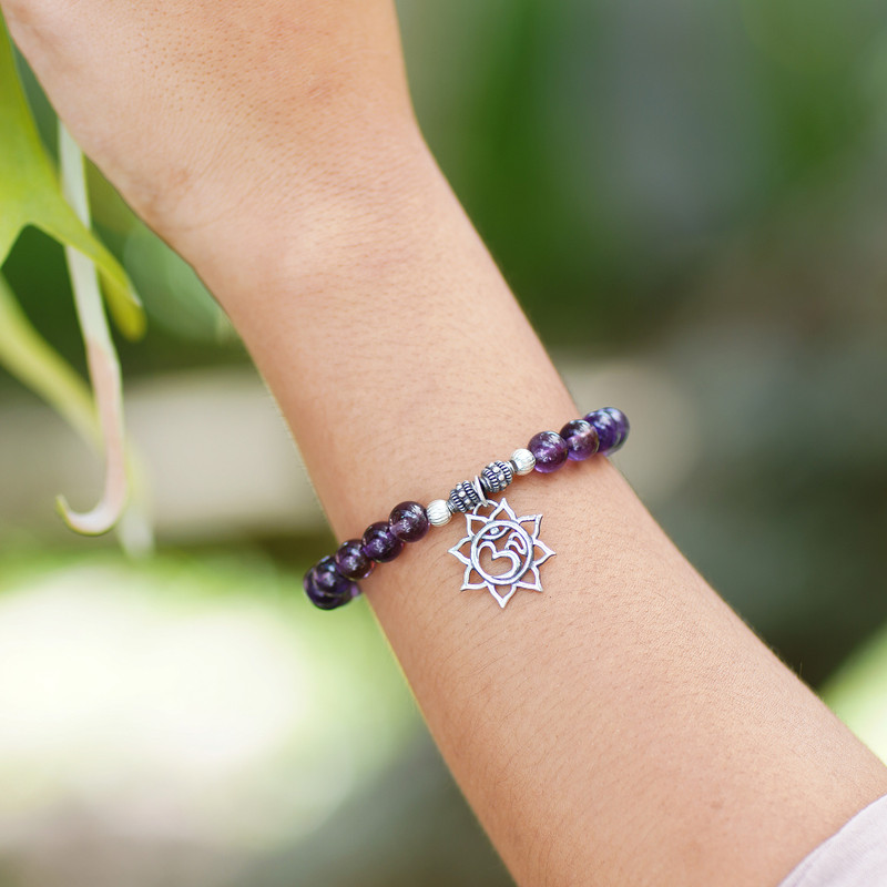 Round beads of purple amethyst circle the wrist in this Balinese stretch bracelet, centered by a floral sterling silver pendant with the omkara symbol for om, a mantra representing universal consciousness. Ketut Sulastri designs this enchanting bracelet.