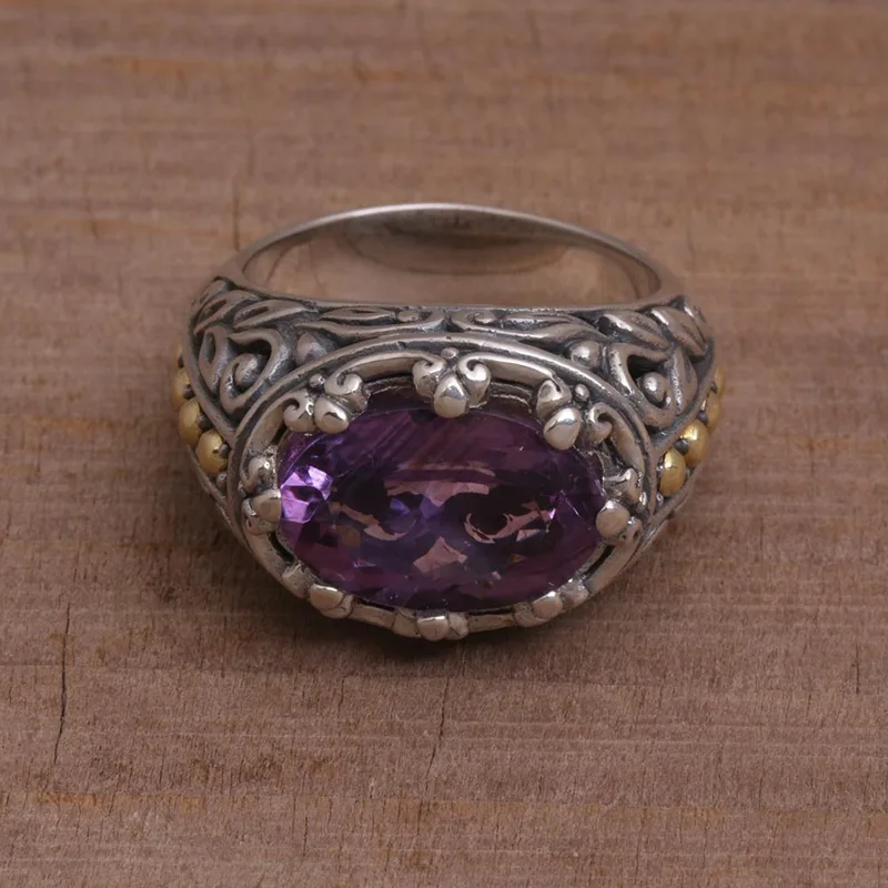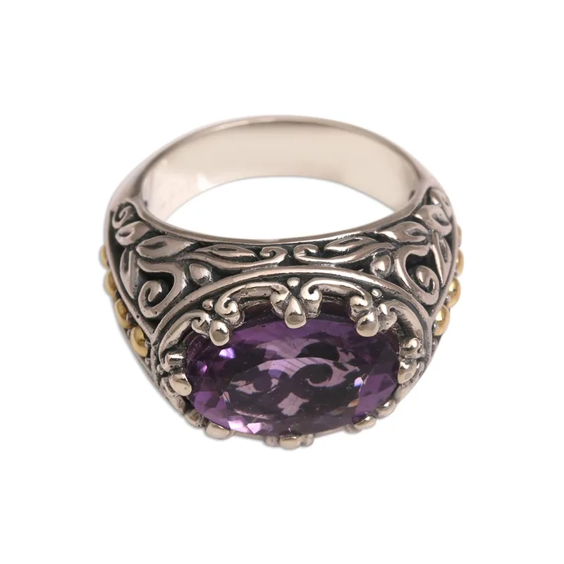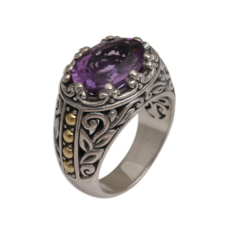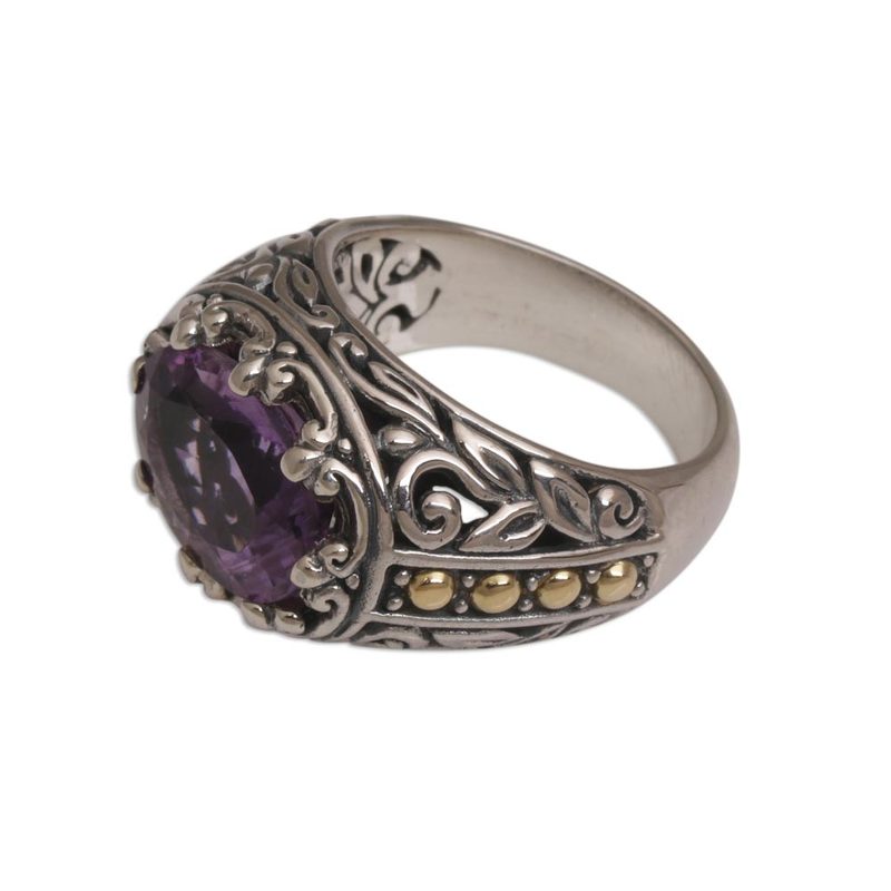 The radiant hue of amethyst dazzles the eye in this ornate cocktail ring. Handmade by Indonesian artisan Kadek Wijanegara, the ring bears a gem weighing seven luscious carats. Sterling silver leaf motifs and gold plated dot accents adorn the ring's wide band.