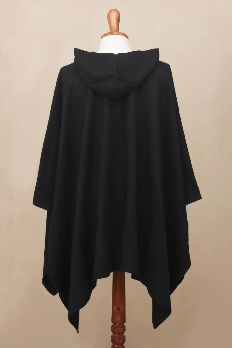 Celinda Jaco designs a men's hooded poncho in a soft black alpaca blend. A drawstring at the neck laces up for snugness. Once reserved for the Inca aristocracy and more recently for special occasions, alpaca is coveted worldwide for its lightweight warmth.