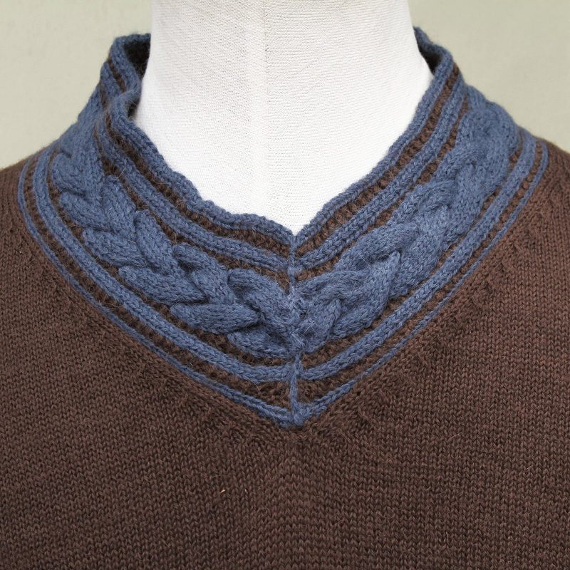 A rich blend of luxurious alpaca wool becomes a handsome men's sweater from the Orkocraft Artisan Association. Blue contrasts with the sleek brown jersey knit to trim the sleeves and hem and form a braid at the neck