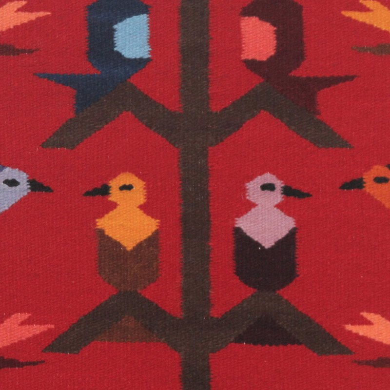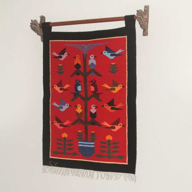 Backed by our Happiness GuaranteeBirds sing together as they flock to the spreading branches of a tree. "This is the Tree of Happiness," says master weaver Cerapio Vallejo. "It signifies the reign of peace and love in your home." A black border frames this stunning red tapestry, hand-woven of virgin wool.