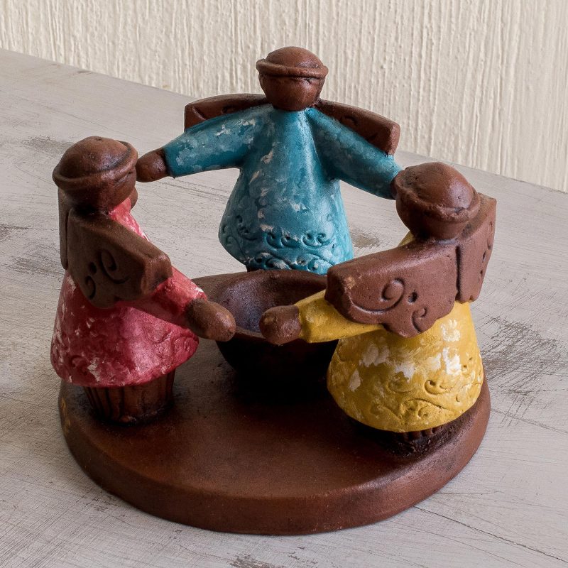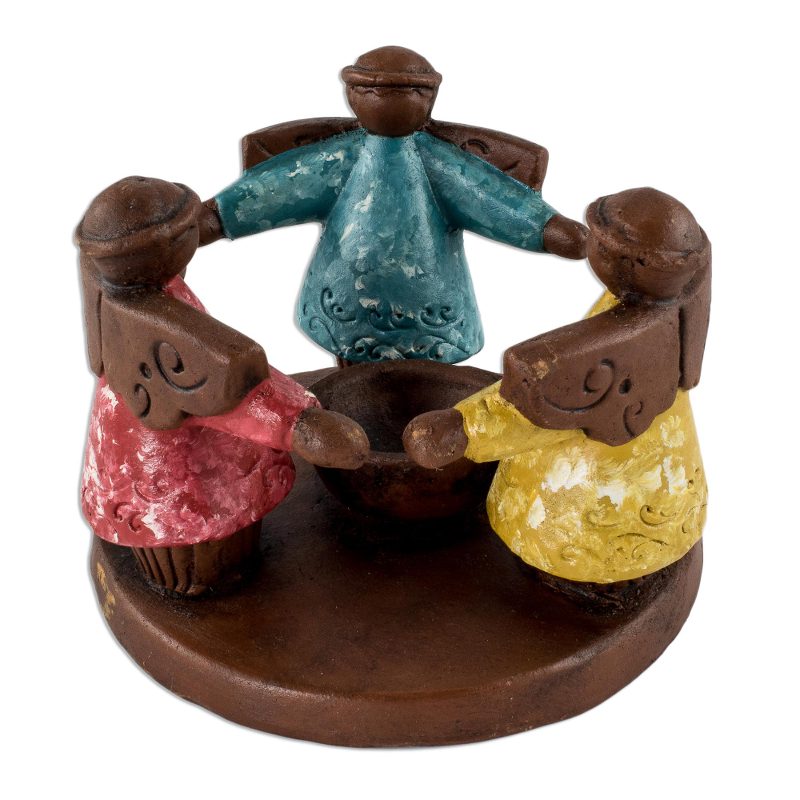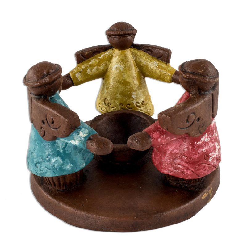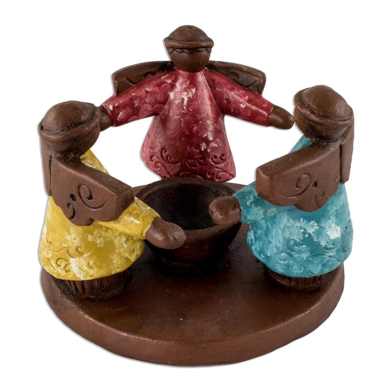 Backed by our 100% Happiness GuaranteeThree angels in colorful gowns stand together with arms outstretched. Depicted in terracotta, the celestial beings surround and protect a tealight. Ceramists from the House of El Salvador Artisans craft this lovely candleholder. The images are painted by hand in cheerful colors.