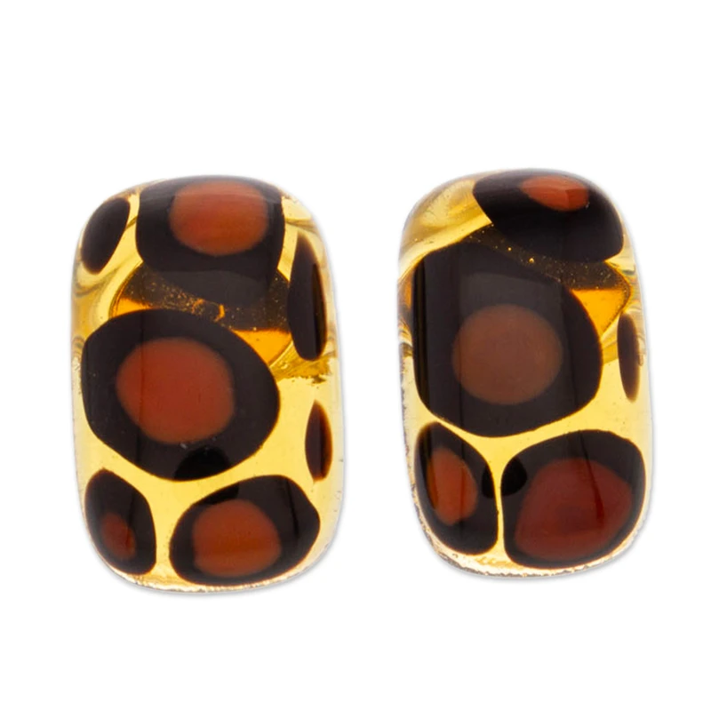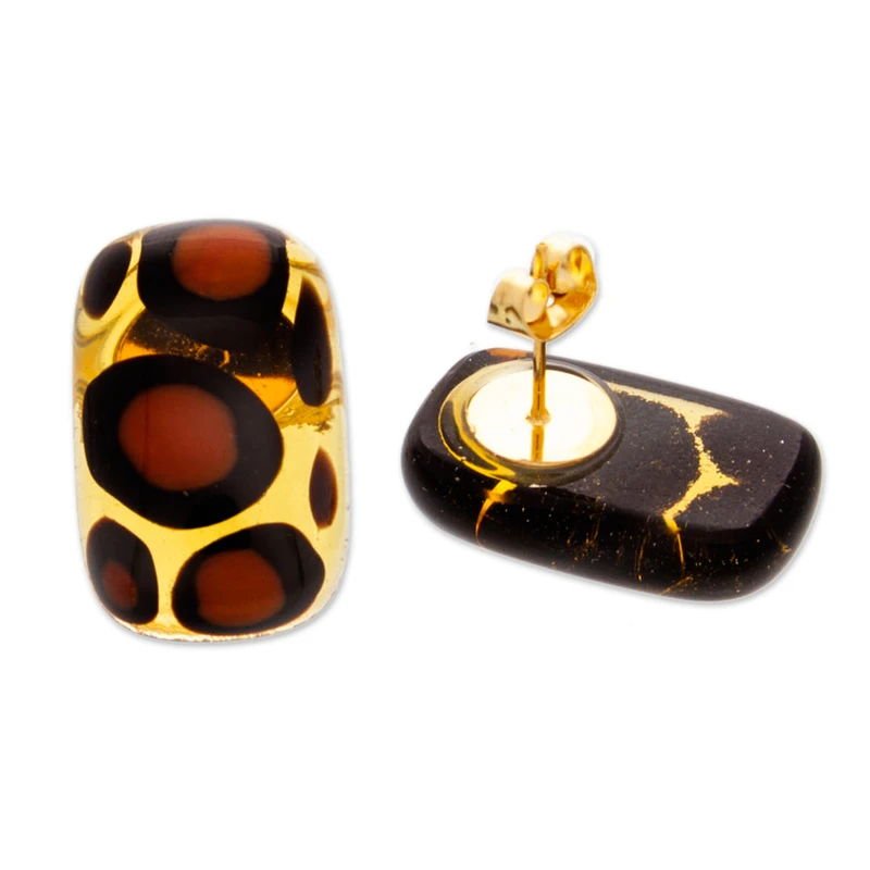 Transform your look from ordinary to extraordinary with these rectangular button earrings filled with exotic flair. The fierce animal print, expertly captured in fused glass by Mexican artisan Fabiola Quevedo, exudes an irresistible allure. Mounted on luxurious 18k gold-plated nickel posts, these fabulous earrings make a bold statement that's impossible to ignore.
