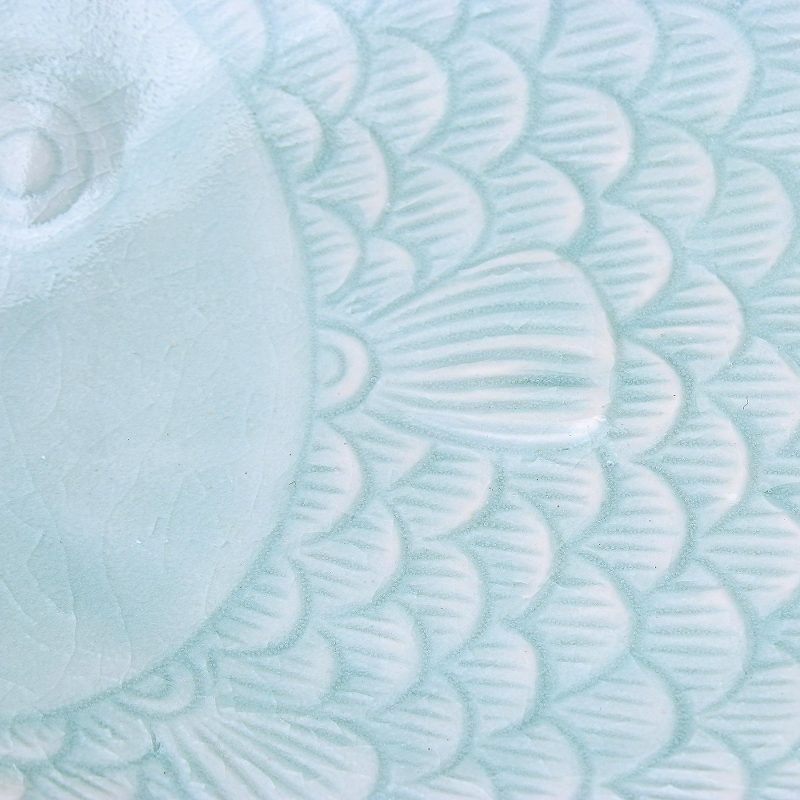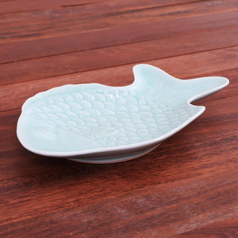 This beautiful serving plate is crafted in the time-honored tradition of celadon ceramics by Penpan in Thailand. The fish-shaped plate is carefully detailed and features a crackled aqua glaze.