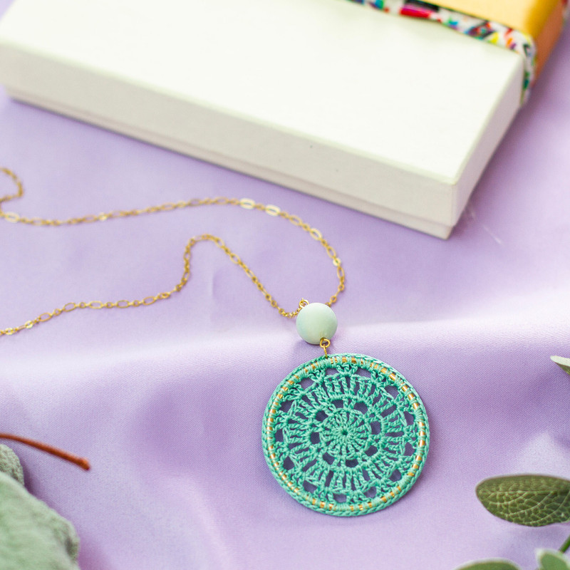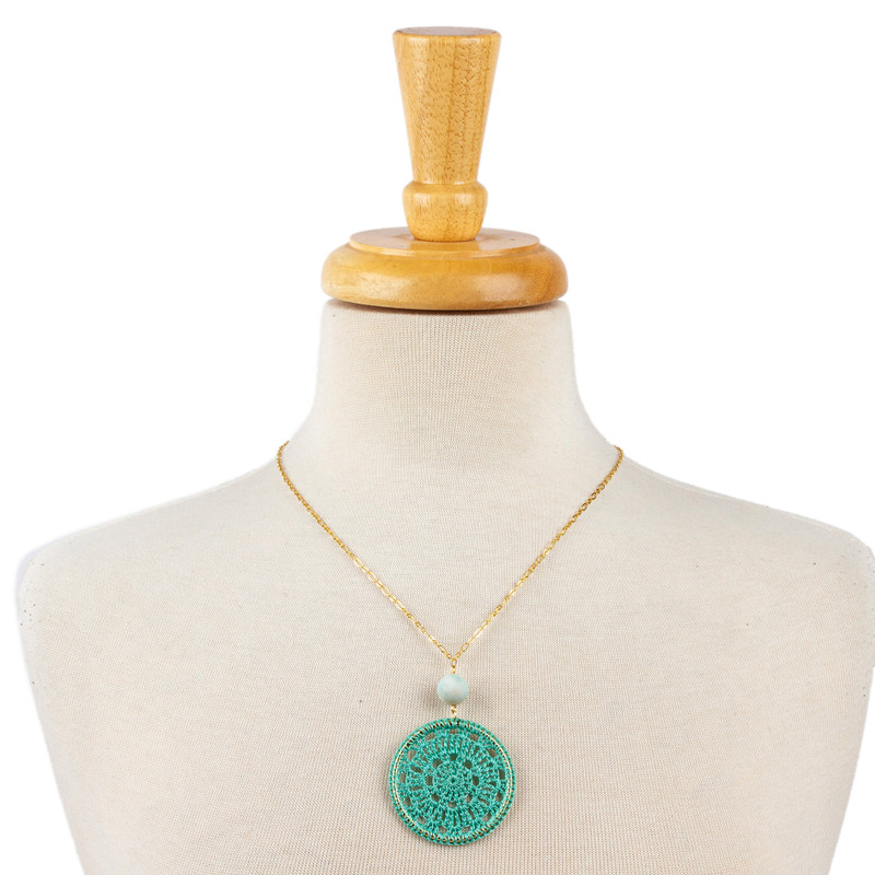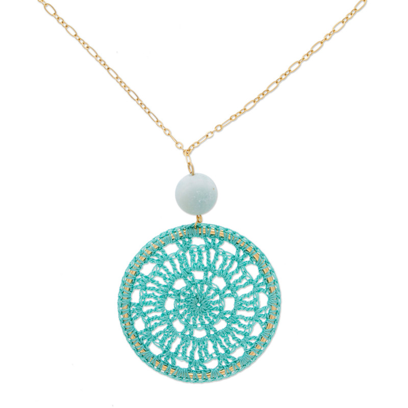 Inspired by Greek mythology, artisan Monserrat Dominguez in Mexico creates this unique pendant necklace. She names this style 'Cyrene', after the Greek princess who was the consort of Apollo and mother of his sons. The necklace features a round hand-crocheted pendant in aqua, topped by a polished bead of amazonite. The pendant centers a 14k gold-plated brass chain.