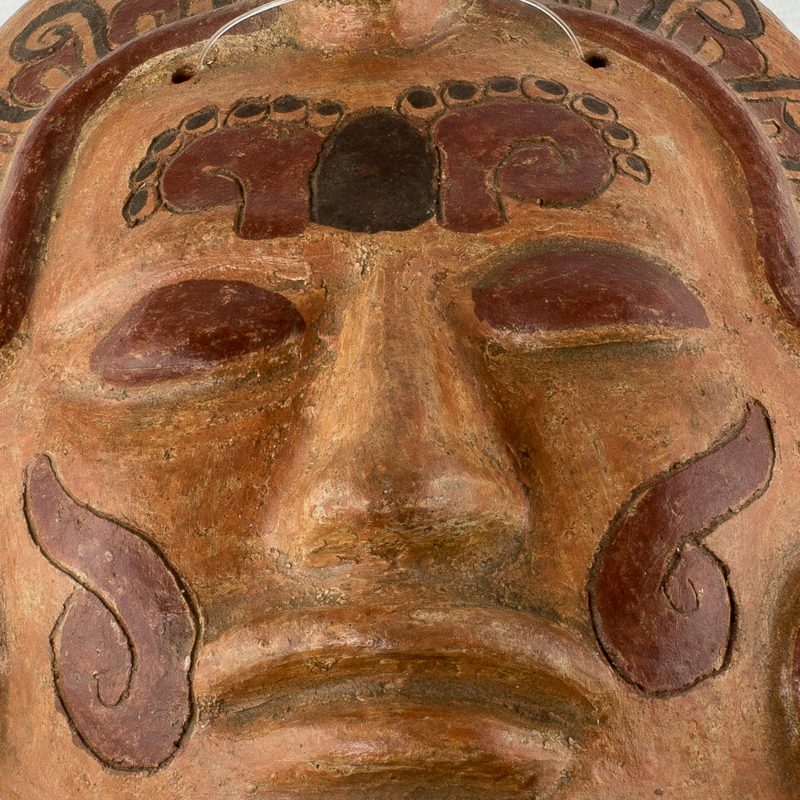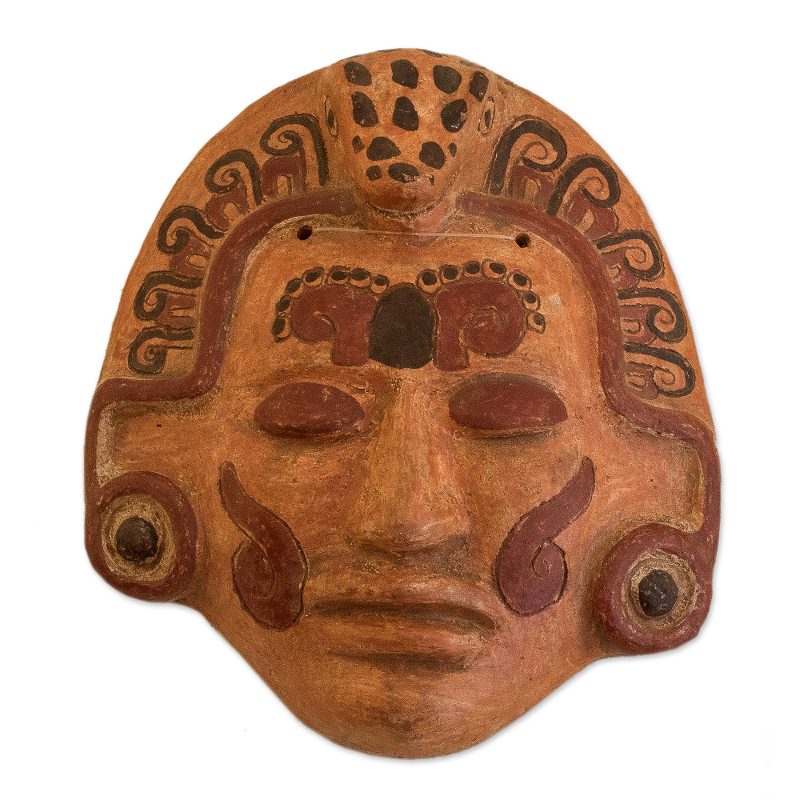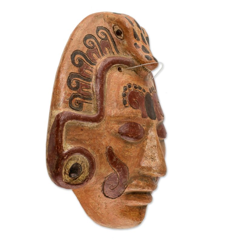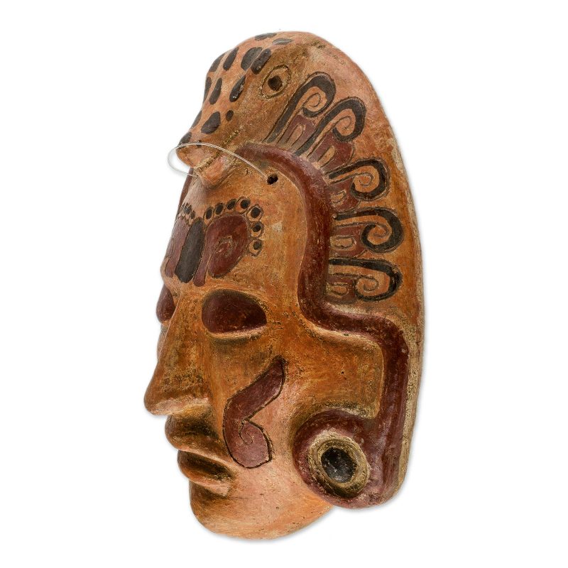 Delivery EstimateBy Oscar Rodolfo Mendoza, this dramatic mask depicts an ancient Maya of noble standing. He wears earrings and a headdress crowned by a spotted crocodile; glyphs adorn his forehead and cheeks. Modern artisans utilize the same materials and techniques as in pre-Hispanic times, achieving the red, yellow and orange colors from annatto seeds.