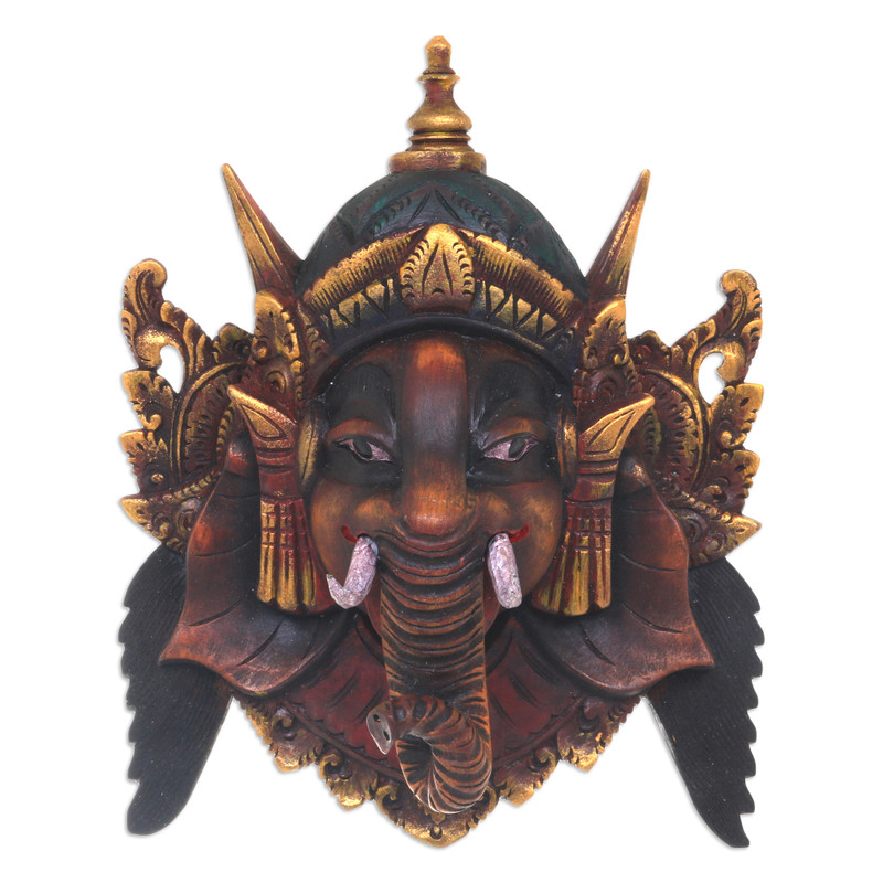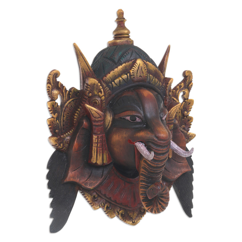 The Balinese workshop of Made Mulyani presents this awe-inspiring mask hand carved from acacia wood. The mask features Lord Ganesha, the elephant-headed Hindu god of prosperity and wisdom. Balinese artisans paint this mask by hand and add gold gilt accents to give this intricate piece an antique finish.