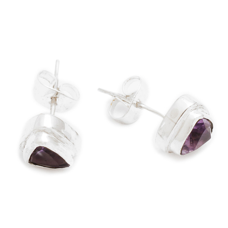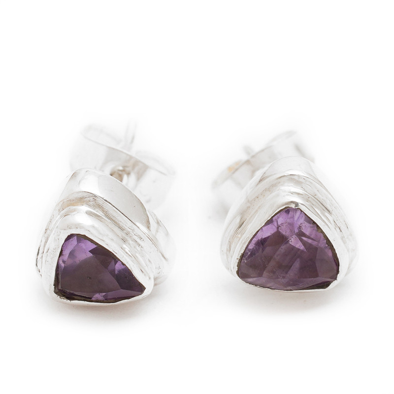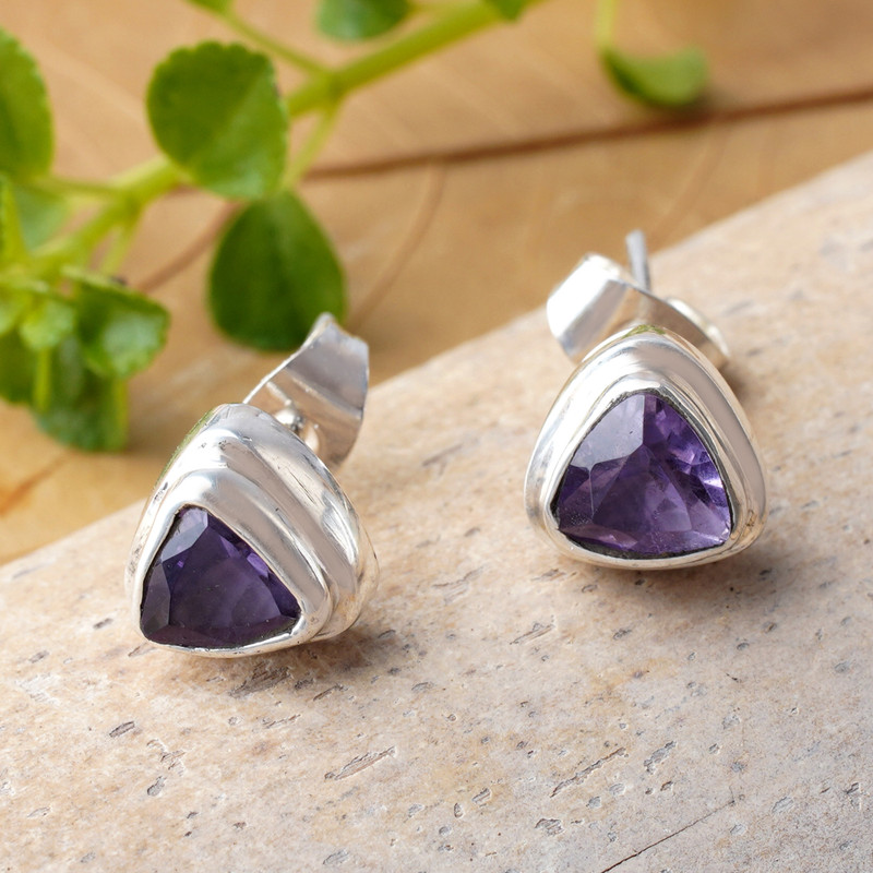 Scintillating trillion-cut amethyst gems are the center of attention in these simple stud earrings from Kenari in Bali. The gemstones, which total one carat, are set in polished sterling silver bezels.