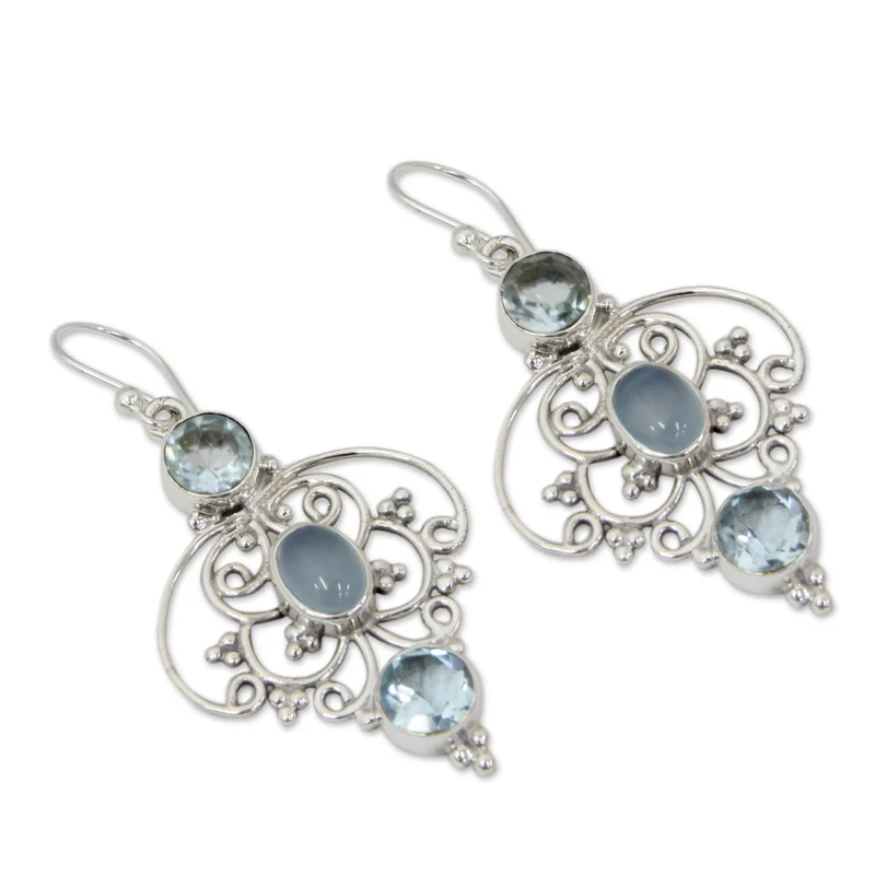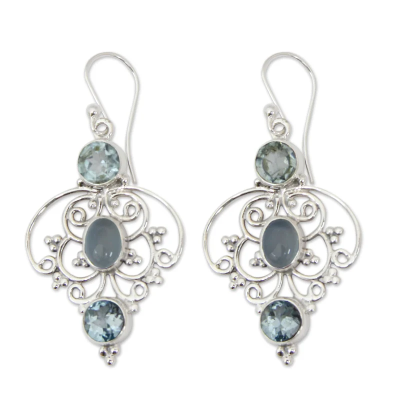 Sterling strands intertwine in graceful arabesques to embrace blue topaz that total 2.9 carats. In the center, chalcedony reveals an enhanced blue glow. Neeru Goel designs these exquisite earrings with modern Indian styling.