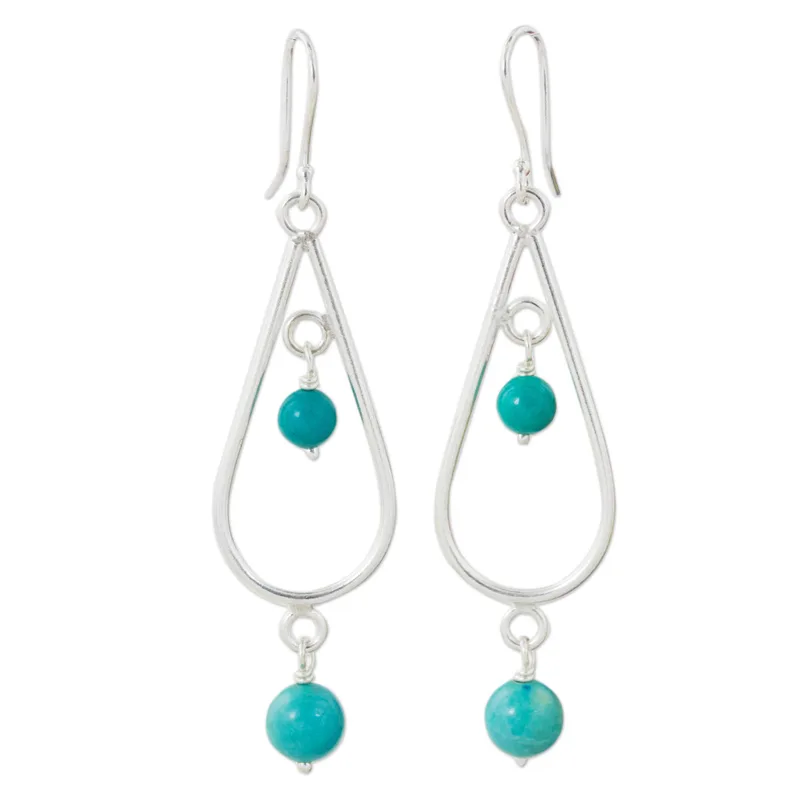Lovely beads of dyed blue-green calcite glisten as they hang delicately from sterling silver earrings in the shape of rain drops. Withaya Cheunjuit presents these hand crafted dangle earrings from Thailand that are sure to complement any outfit.