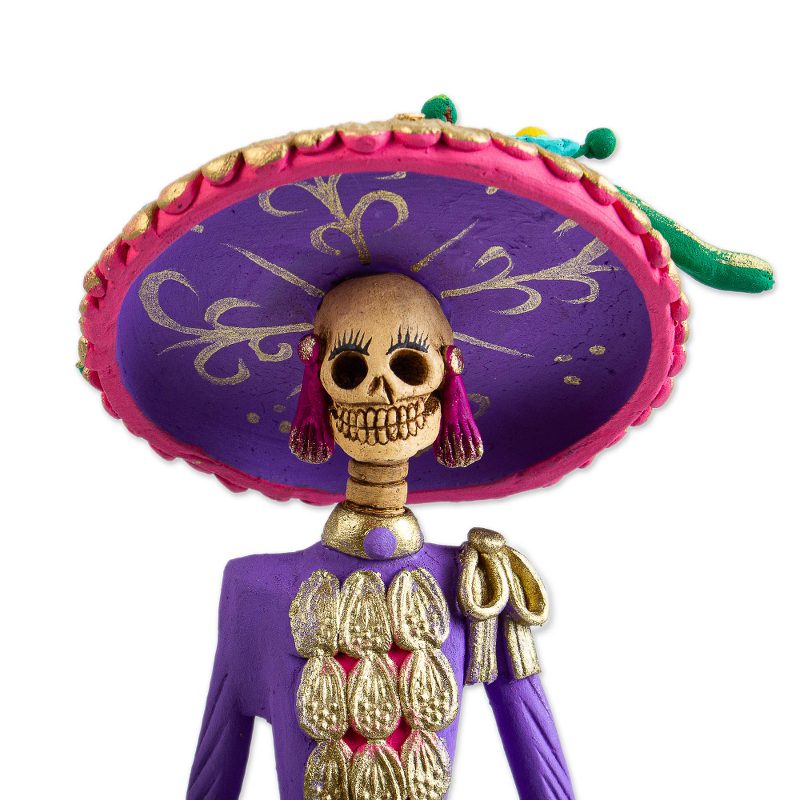 Artisan Luis Morales of Mexico crafts a breathtaking ceramic Catrina to grace your mantel or shelf. Formed by hand from clay, her ensemble is carefully painted in purple, pink and fuchsia with golden accents. She carries a handbag and flaunts a magnificent hat. The elegant figure is based on a satirical etching created by Mexican artist José Guadalupe Posada around 1910-1913. With his etching, Posada poked fun at those Mexican natives who tried to emulate the fashion and habits of the European aristocracy. Today, la Catrina has become the instantly recognizable icon of Día de los Muertos (Mexico's Day of the Dead).