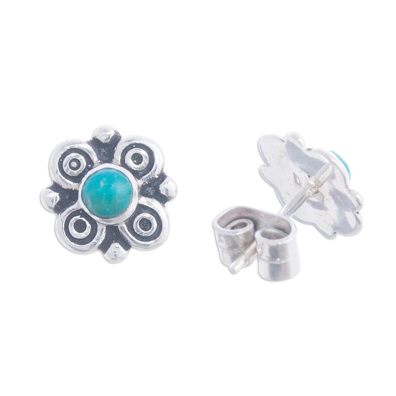 Crafted from silver, circular patterns surround two divine gems of blue-green chrysocolla, which some refer to as "Peruvian turquoise." Sonia Cachi designs this cute pair of stud earrings.