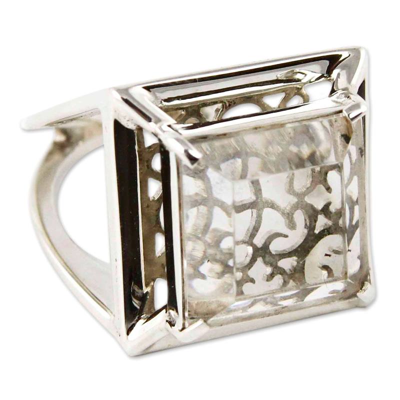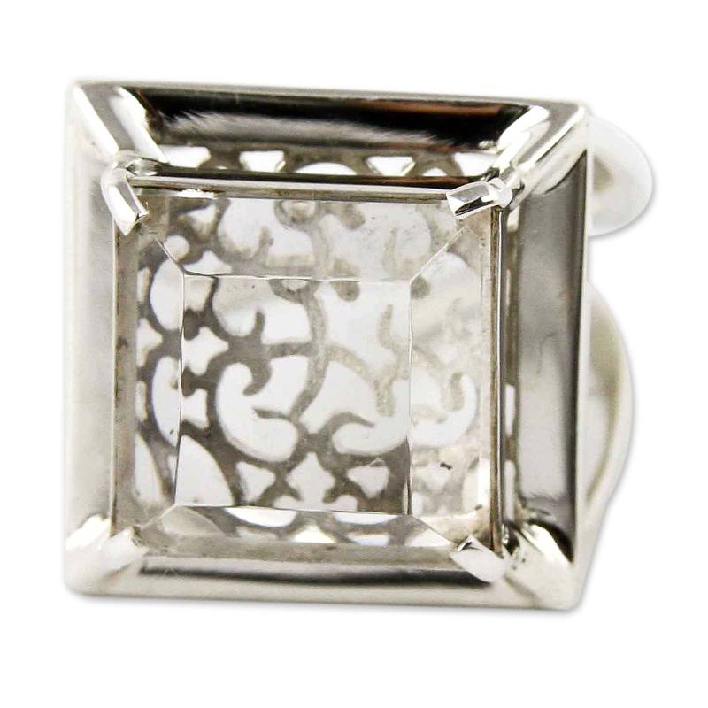Maria Huerta finds inspiration in the architectural artistry of old Lima for the design of this ring. She crafts the sterling silver ring by hand, featuring curling vines resembling those on doorways of yore. Crystal quartz, the April birthstone, crowns the ring, revealing the magnificence of the openwork patterns beneath.