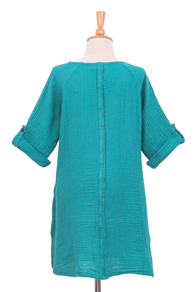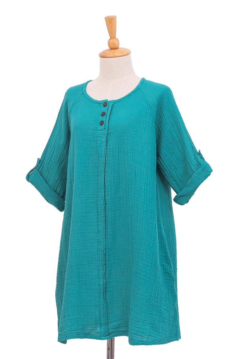 Backed by our 100% Happiness GuaranteeLong and swingy, this tunic is from Ying and Joy in Thailand, who craft it from double cotton gauze in an appealing shade of sea green. The top features three-quarter length roll-tab sleeves and a Henley-style button placket with coconut shell buttons.