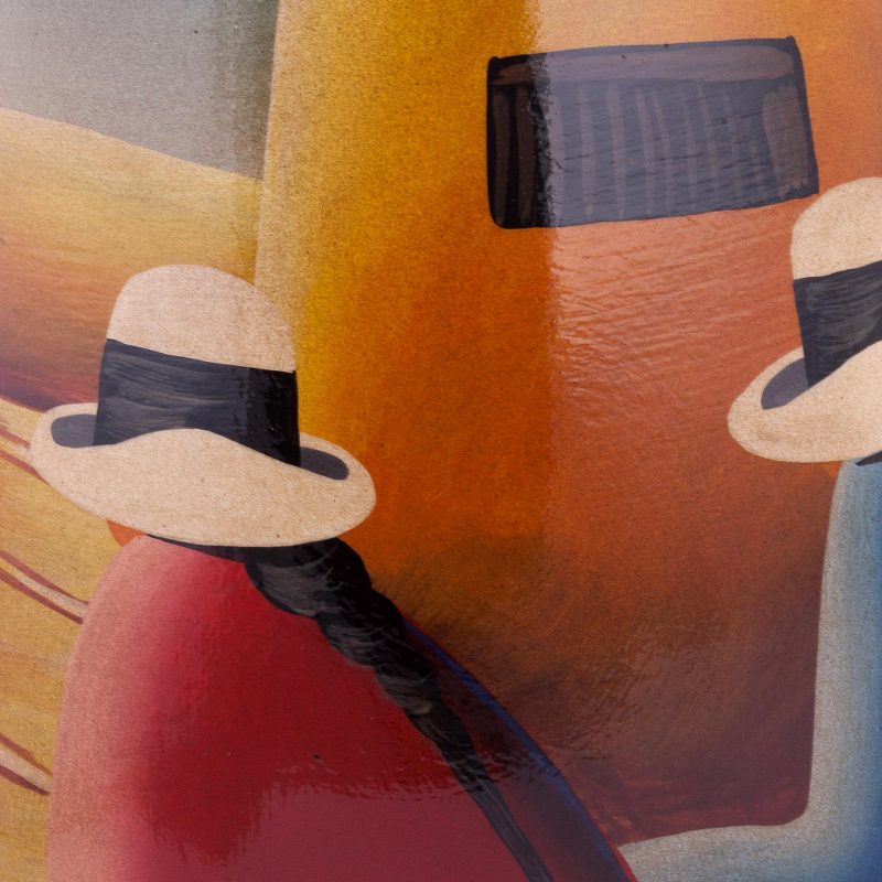 This vase depicts a group of women sitting outside of a convent. The incredibly vivid colors and geometric shapes employed by the artist convey the life of the people illustrated here. Francisco Coronado uses the passion of various colors and contrast of black alongside bright yellow, to make a dance of harmonious color bursts in unexpected places.