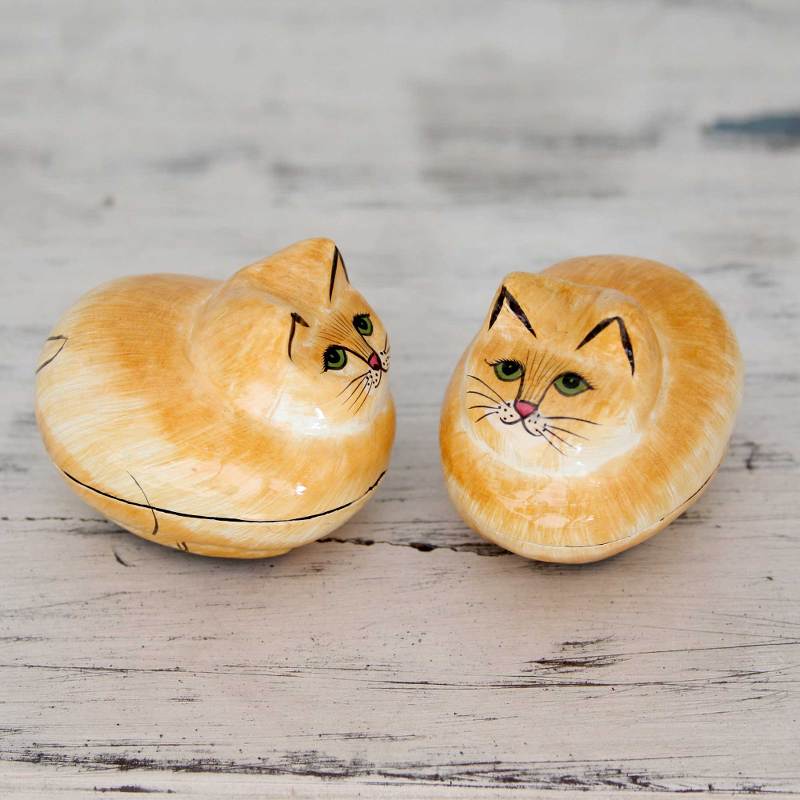 You can find our papier mache boxes 'Charismatic Cats' (pair) by Fida Hussain in decor accessories categories such as Animal Themed Decorative Boxes and Papier Mache Decorative Boxes. Enjoy exploring these sections for other Novica treasures.