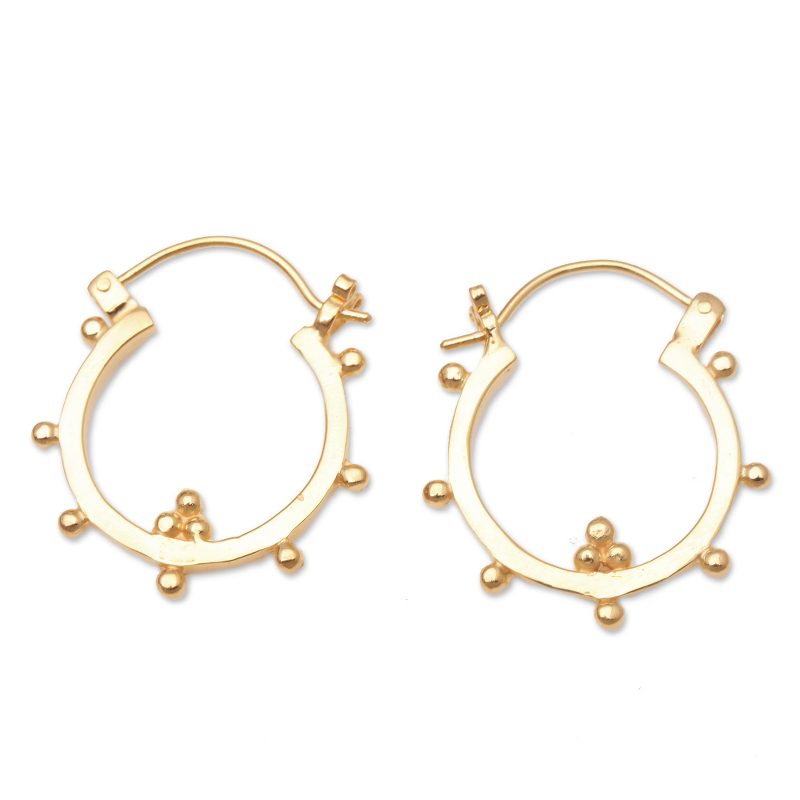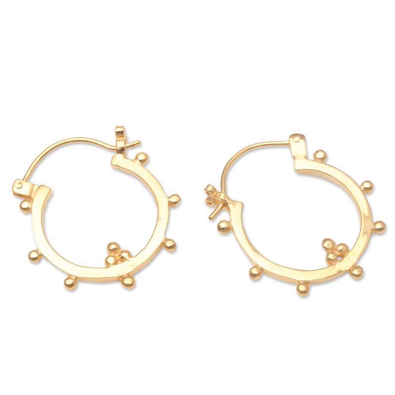 Presented by Putu Putri in Bali, these beautiful hoop earrings are accented by shimmering golden beads. Balinese artisans hand craft the hoops from 18k gold-plated sterling silver, accenting the precious metal with a delightful beaded motif.