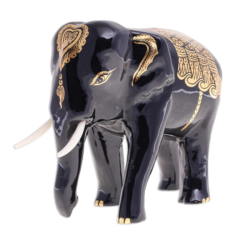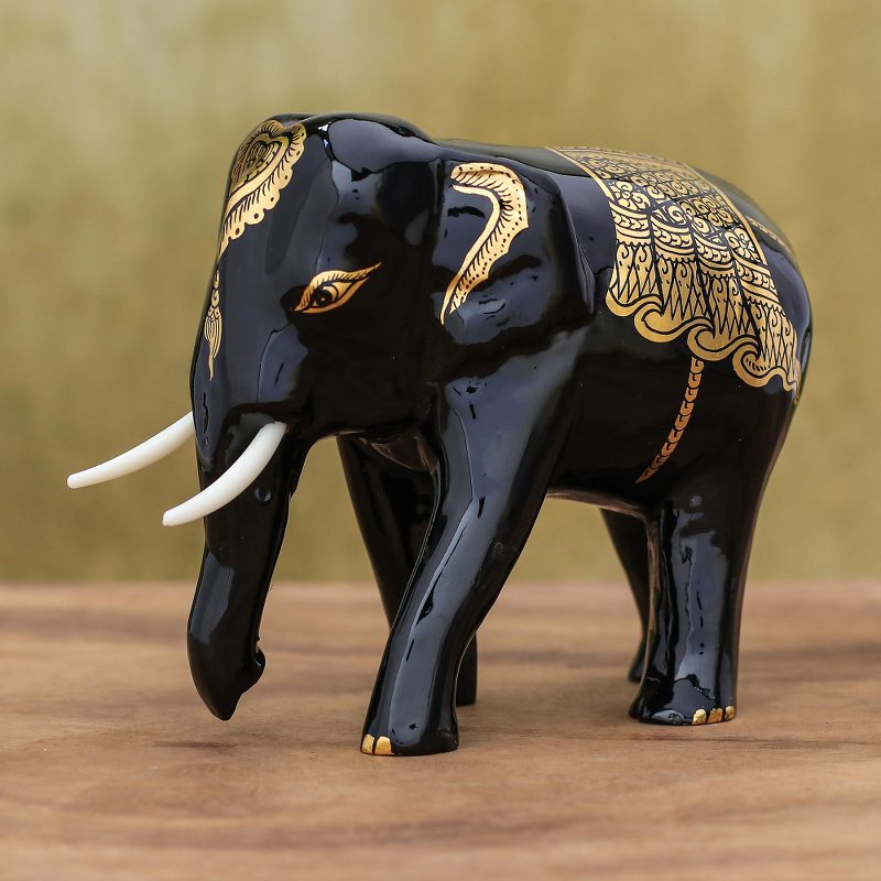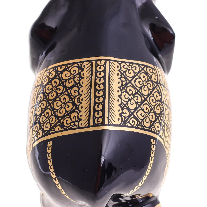 Presented by Subin Tositarat, this elephant sculpture gleams with several coats of glossy black lacquer. Thai artisans carve the sculpture from raintree wood, coating the gentle beast in lacquer before describing his attire with shimmering 24k gold foil.