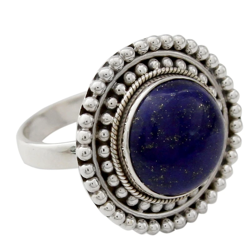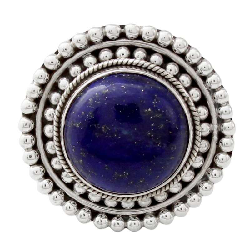 Glistening like a clear sky at dusk, a circular gemstone of precious lapis lazuli sits atop a sterling silver crown. Neeru Goel of India presents this sterling silver cocktail ring, reminiscent of a royal sunset on a summer evening.
