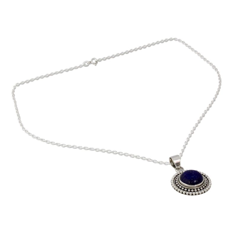 Glistening like a clear sky at dusk, a circular gemstone of precious lapis lazuli shines in this hand crafted sterling silver pendant. Neeru Goel of India presents this sterling silver pendant necklace, reminiscent of a royal sunset on a summer evening.