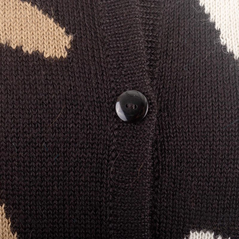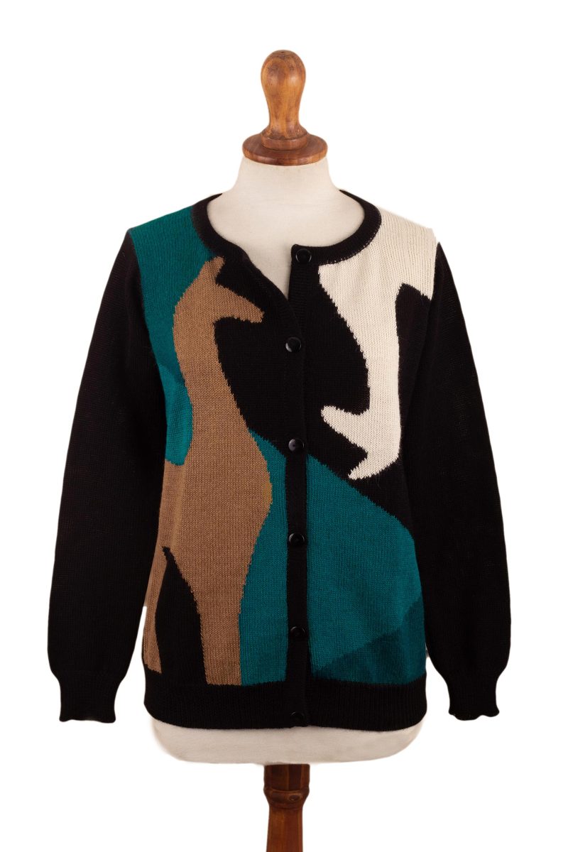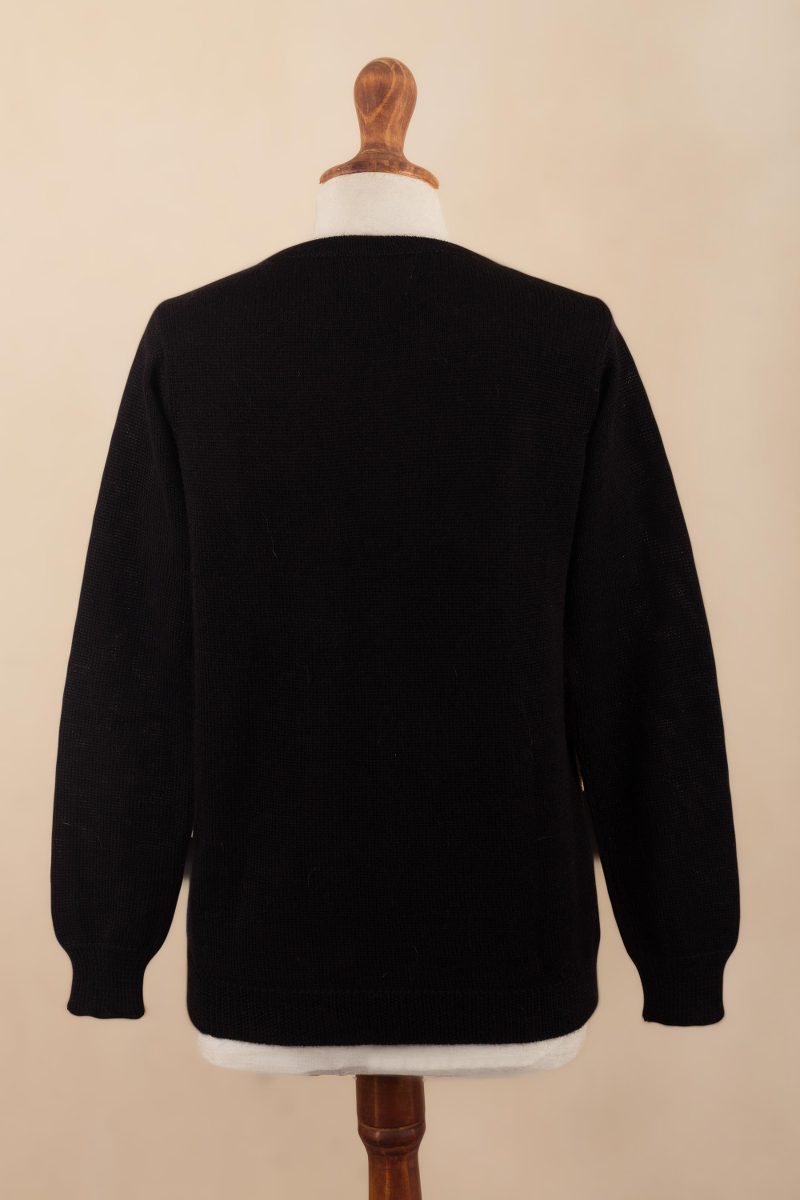 Hand knit using the intarsia technique, this cardigan sweater designed by Anaychay in Peru is stunning. The artisans use soft, warm 100% alpaca wool, a fiber highly prized by the ancient Inca. The front of the sweater features a bold graphic llama design in black, white, spice and emerald; the back is solid black.