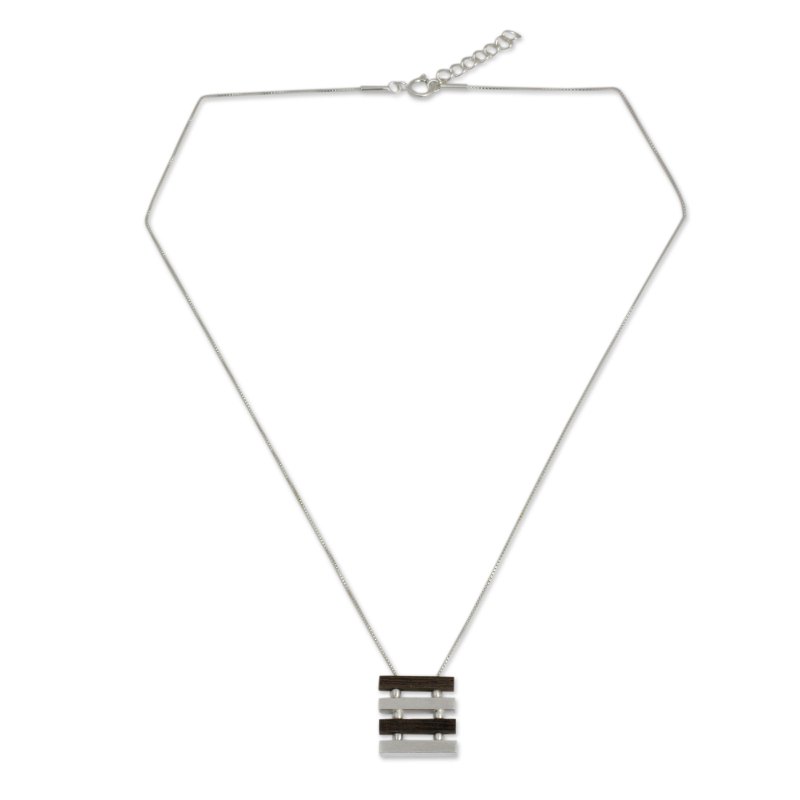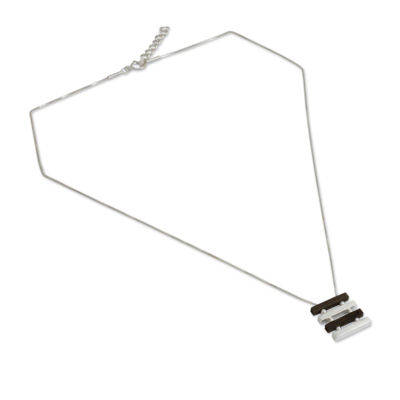 Nature's vital balance is captured in the minimalist design of this extraordinary necklace. Sarote Lochotinunt crafts the pendant by hand, alternating the noble grain of Indian elm wood with brushed satin sterling silver. The original pendant is worn on a Venetian box chain.