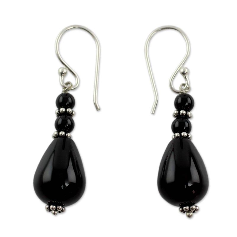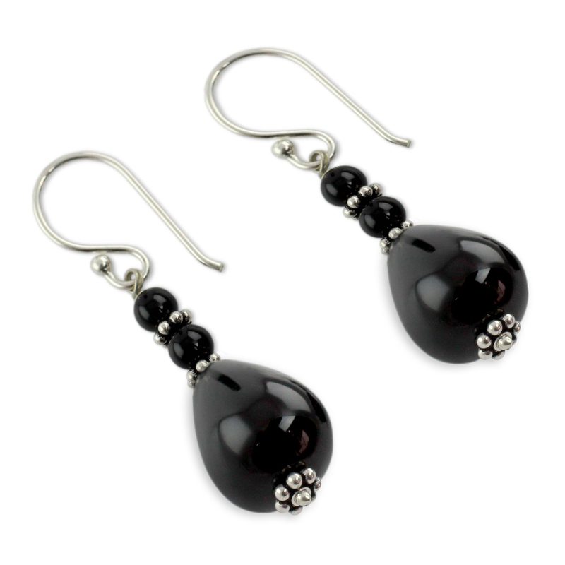 The elegant glow of onyx is captivating inearrings by Narayannii highlights. Onyx jewelry is believed to defend against negativity. The earrings are crafted by hand with sterling silver.