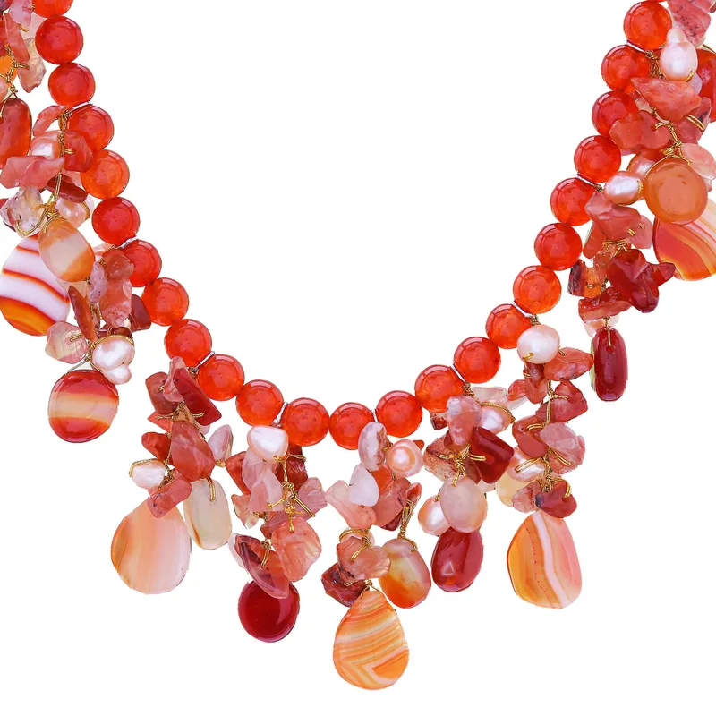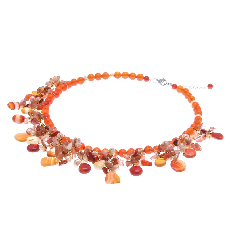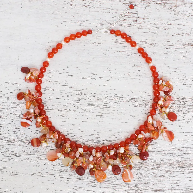 Knotted by hand on golden strands, gemstones cluster in an opulent necklace. Nareerat combines cultured pearls in warm peach tones with carnelian, chalcedony globes and colorful glass beads. The extender chain and clasp are bathed in shining sterling silver.