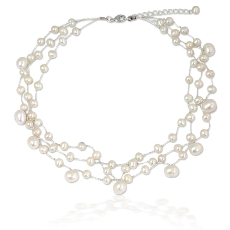 Backed by our 100% Happiness GuaranteeAnusara explores the mystique of moonlight in a stunning handcrafted necklace. Knotting white pearls on gossamer strands of silk, she reveals her originality and talent. The choker fastens with a stainless steel clasp.