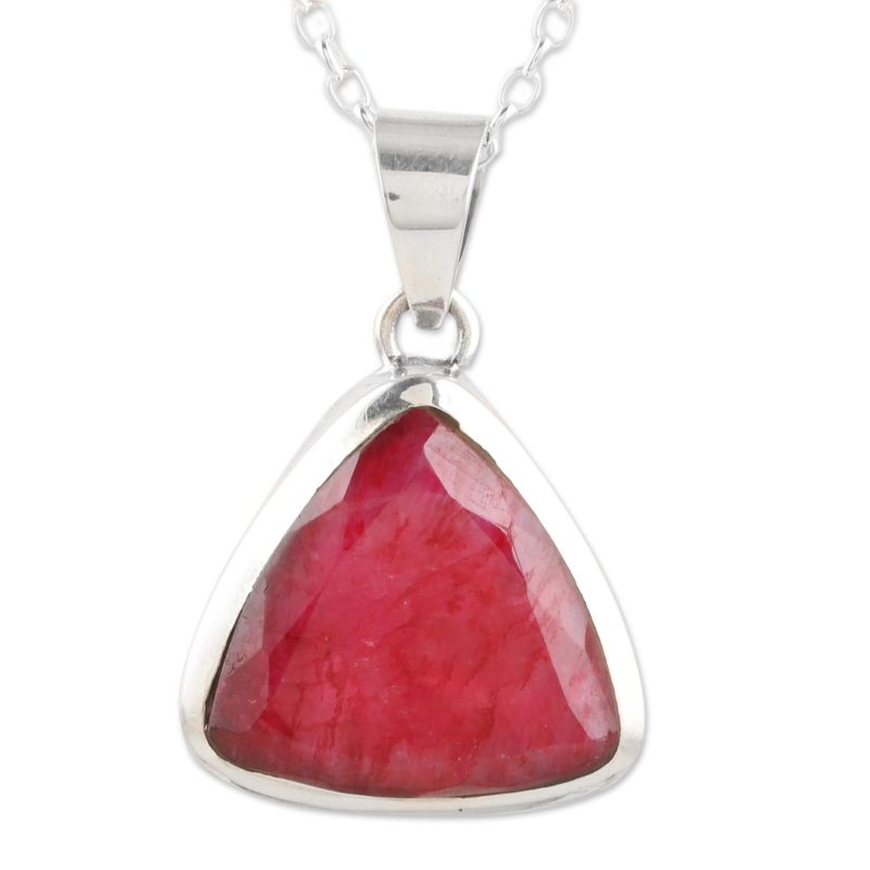 Romantic and flirty, deep pink is also the color of passion. Designed by Bhavya Jain, this pendant necklace has plenty of passionate color to spare. Indian artisans use sterling silver to hand craft the necklace, suspending a faceted 8-carat ruby from a sleek cable chain.