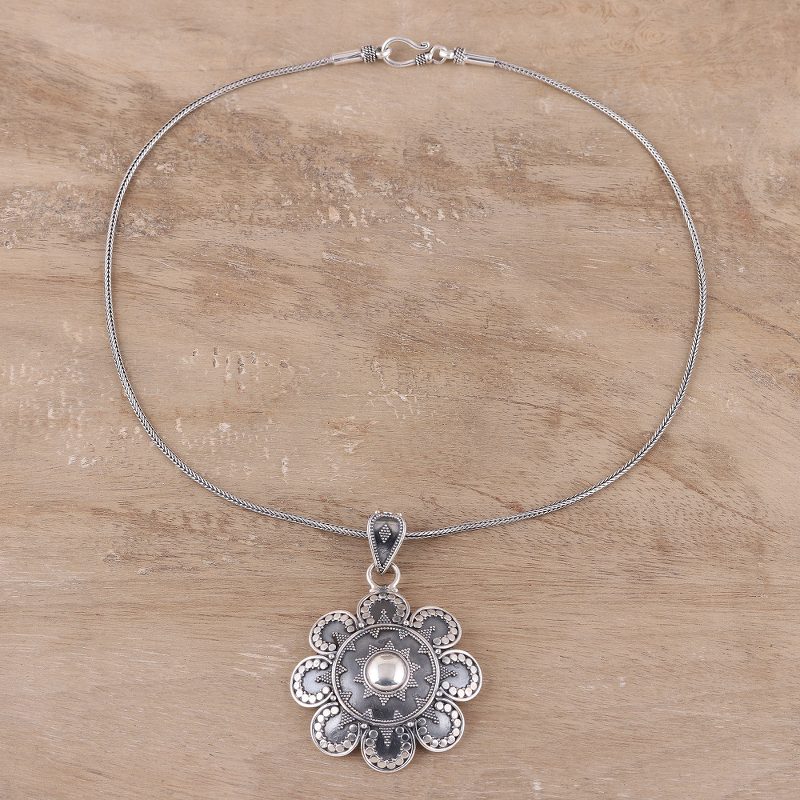 You can find our sterling silver pendant necklace 'Artisanal Flower' by Bhavya Jain in jewelry categories such as Floral Necklaces, No Stone Necklaces, Silver Necklaces, Sterling Silver Necklaces and Pendant Necklaces. Enjoy exploring these sections for other Novica treasures.