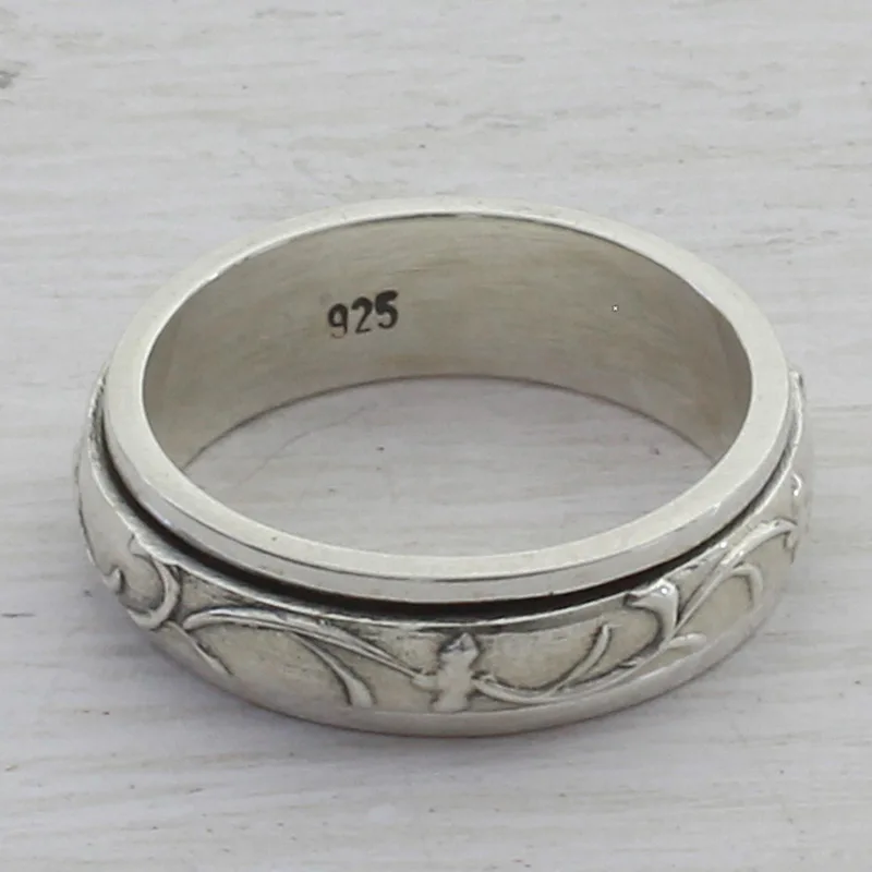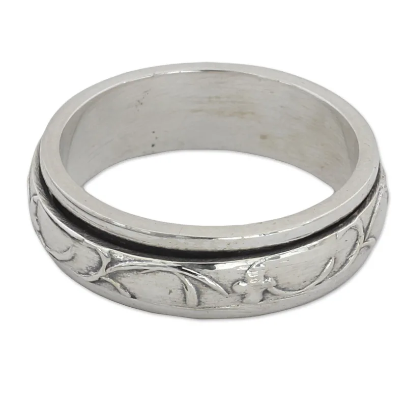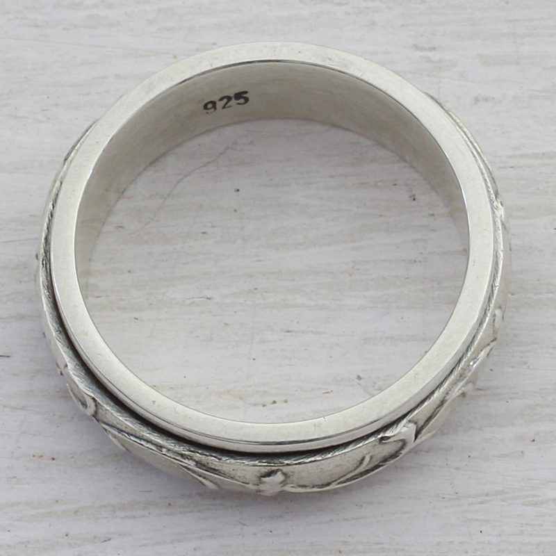 Petite vine motifs with an earthy vibe spin around a simple band in this meditation spinner ring from India. Following in the footsteps of his father, Bhavesh presents an intriguing design crafted by hand of sterling silver.